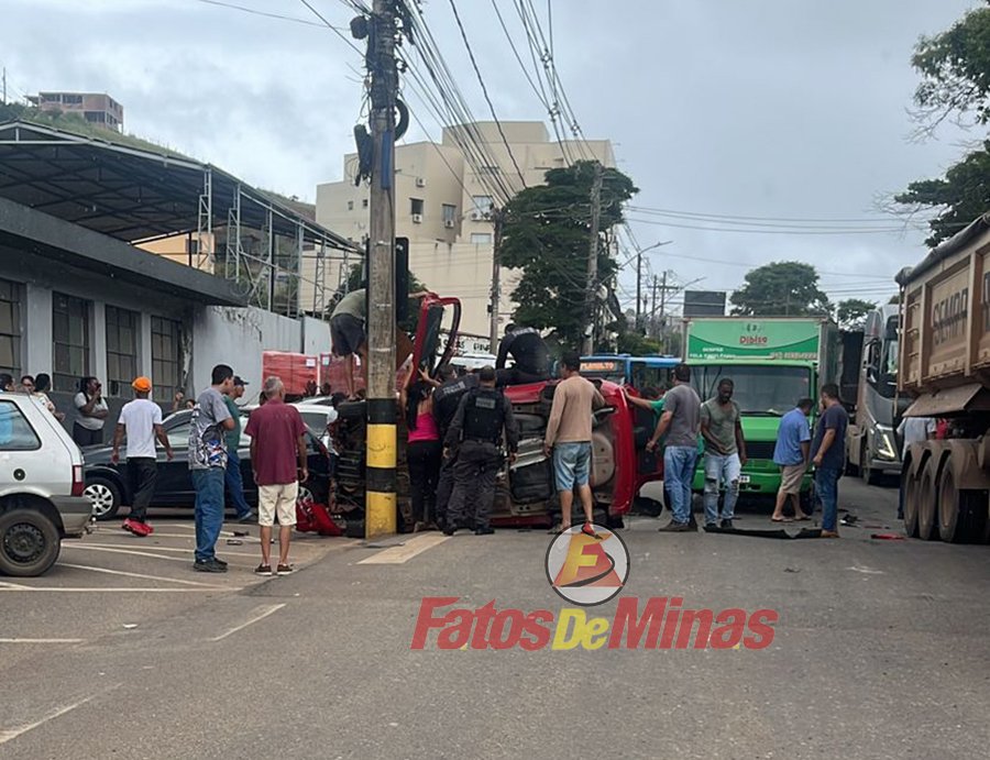 JOÃO MONLEVADE (MG) – Um acidente de trânsito envolvendo uma carreta e um carro de passeio foi registrado na manhã desta quinta-feira, dia 26 de fevereiro de 2026, na avenida Getúlio Vargas, no bairro Baú, em frente ao presídio, em João Monlevade. Após a colisão, o automóvel tombou na pista e só parou ao atingir um poste, ficando completamente destruído.