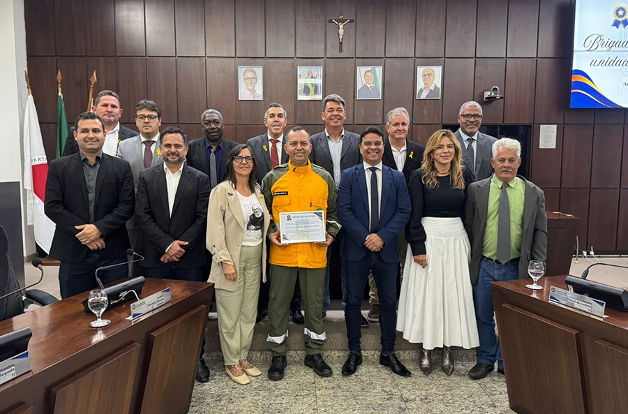 A homenagem foi entregue pelo presidente da Casa, Fernando Linhares, autor da proposição, ao presidente da Brigada, Saulo Amaral do Nascimento, que representou a equipe durante o ato oficial.