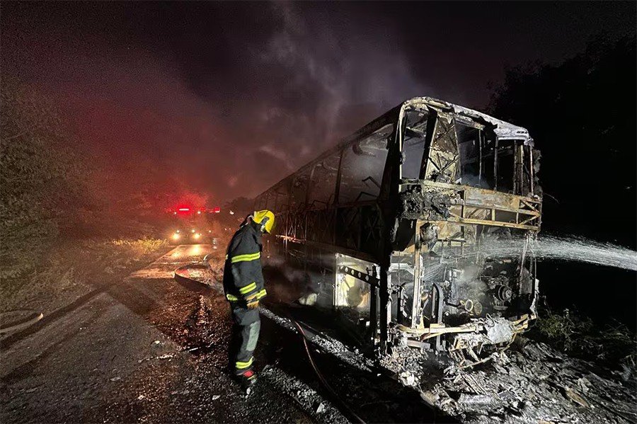 JANAÚBA (MG) – Um ônibus de turismo, com 19 passageiros, pegou fogo durante a madrugada deste sábado dia 9 de março, na rodovia MG 122, altura do km 170, próximo a zona rural de Janaúba, na região Norte de Minas Gerais. O coletivo seguia de São Paulo com destino a cidade de Espinosa. Um dos passageiros foi socorrido com sintomas de intoxicação. A causa do incêndio é investigada.