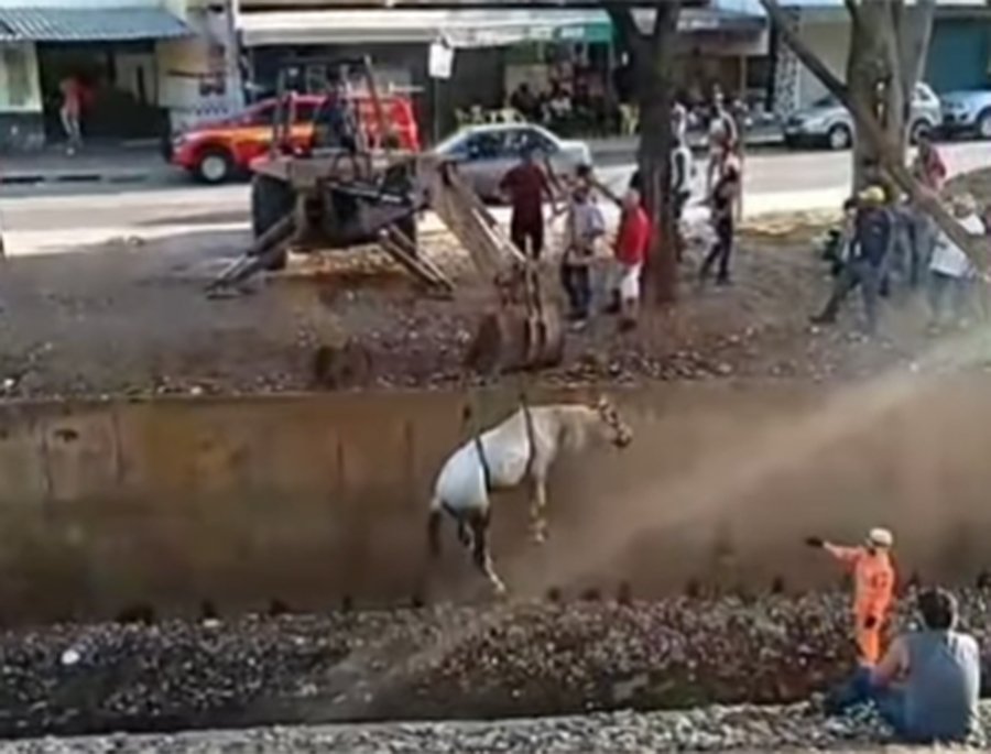 ITABIRA (MG) – Um cavalo fraturou a pata dianteira esquerda ao se assustar e cair dentro do canal do bairro Praia.