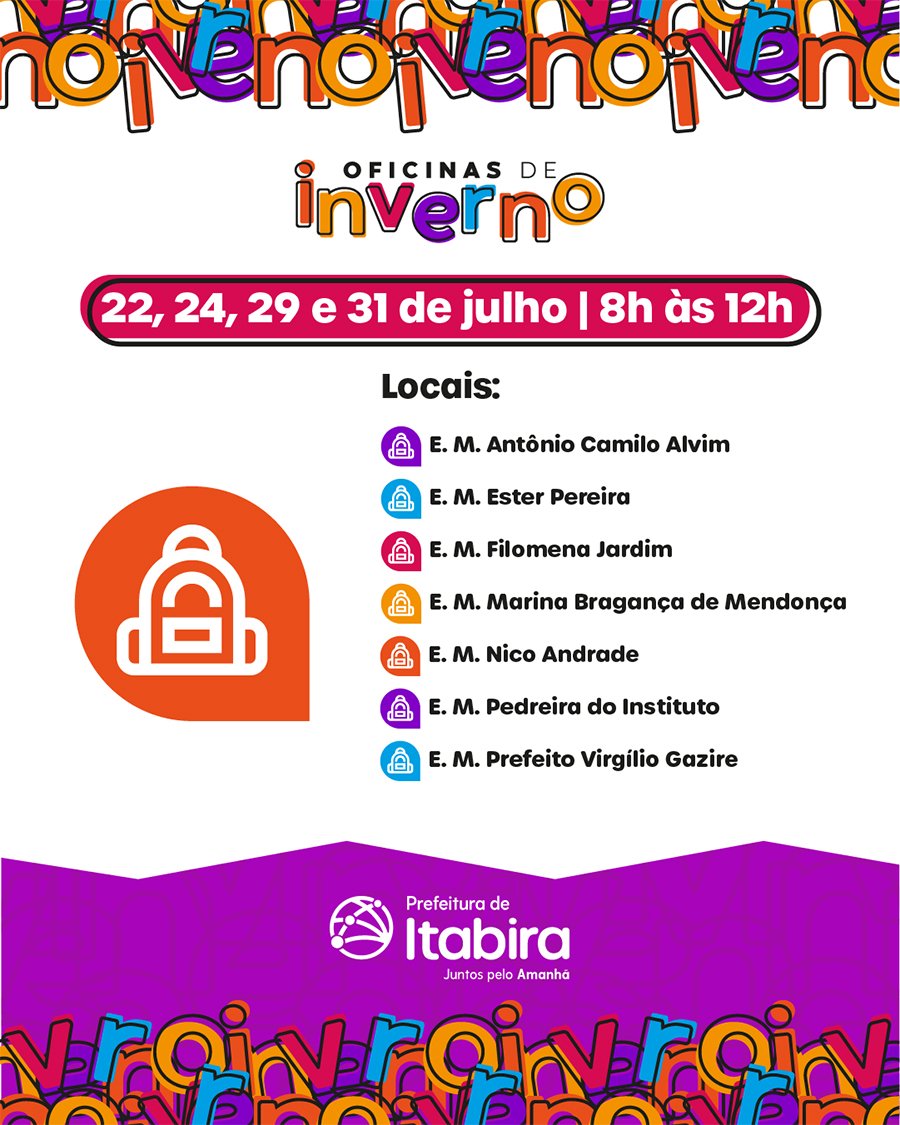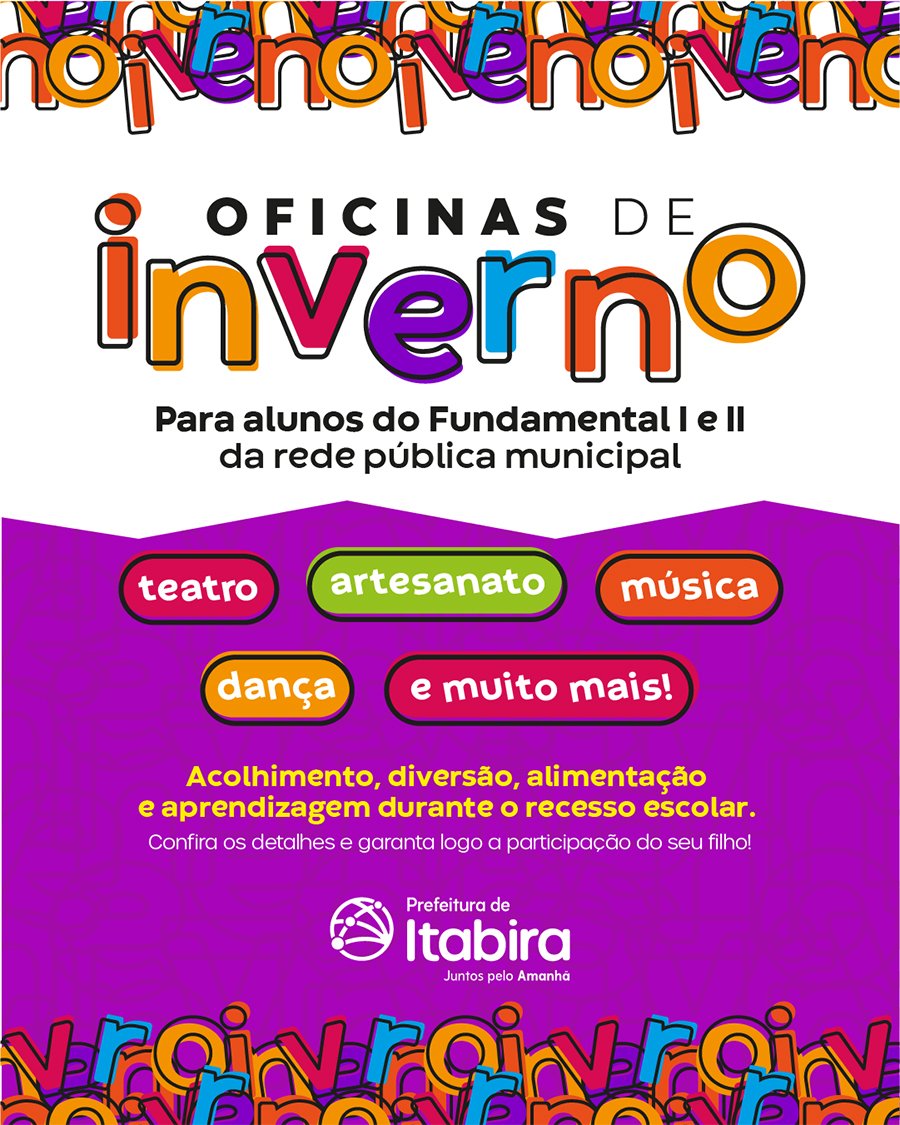 ITABIRA (MG) – Chegou o recesso escolar e, com ele, a Prefeitura de Itabira promove as Oficinas de Inverno. A atividade, realizada por meio da Secretaria Municipal de Educação, promete encher de cor, alegria e criatividade as férias dos estudantes da Rede Municipal de Ensino. Durante os dias 22, 24, 29 e 31 de julho sete escolas estarão abertas para os alunos do Fundamental I e II, no horário das 8h às 12h, com diversão e interação.