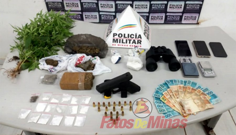 No local, foram apreendidas porções de maconha e cocaína, meia barra fracionada, balanças de precisão, dinheiro em espécie, sacos plásticos, além da pistola 9mm carregada com 17 munições. Um dos detidos também portava um carregador com quatro munições na cintura.