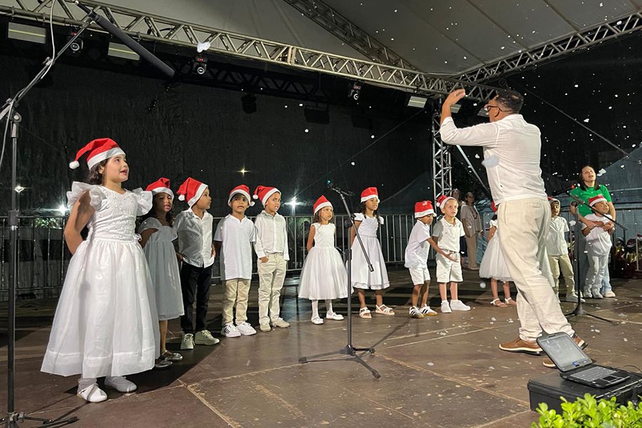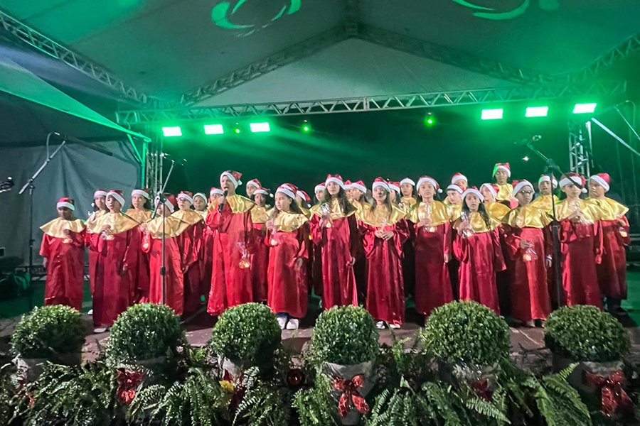 Encerrando as apresentações, os alunos da Escola Municipal de Tempo Integral Maria de Lourdes Duarte Moreira dos Santos, regidos pelo professor Marcelo Hautequeste, cantaram “Terra Seca”, “Feliz Natal (Carrossel)” e “Santo Pra Sempre”, finalizando a noite com mensagens de fé, paz e gratidão.
