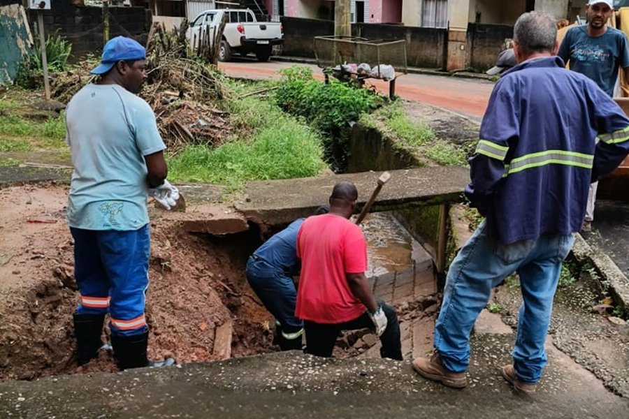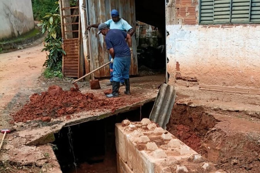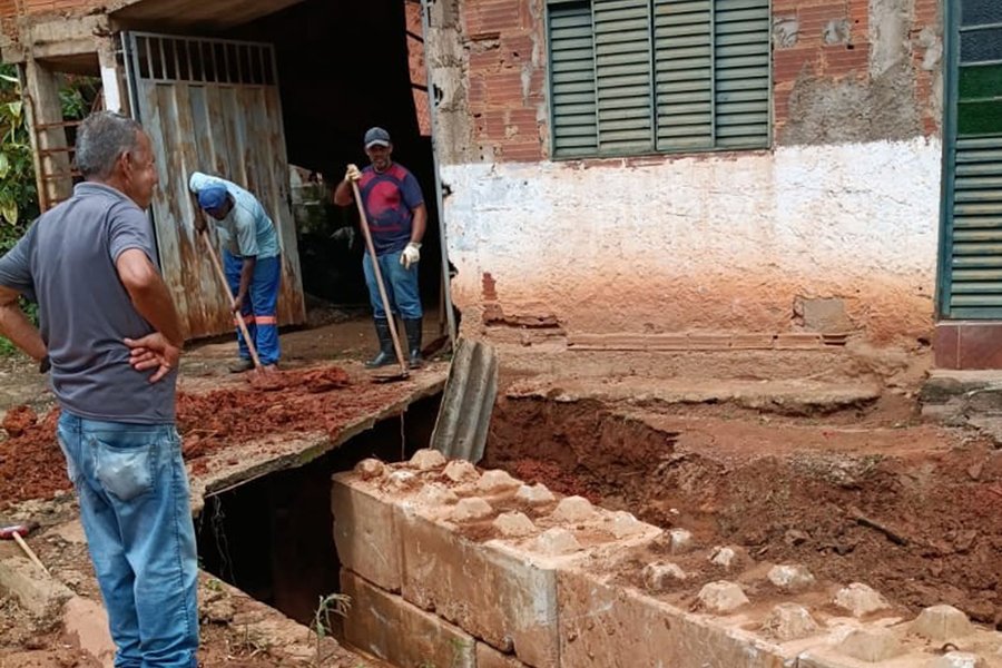A ação foi realizada após vistoria técnica da Defesa Civil, que identificou comprometimento estrutural em uma parede de concreto existente às margens do córrego. A estrutura apresentava trincas e acabou cedendo, situação agravada pelo período chuvoso, gerando risco potencial à estabilidade do terreno e à segurança de uma residência situada nas proximidades.
