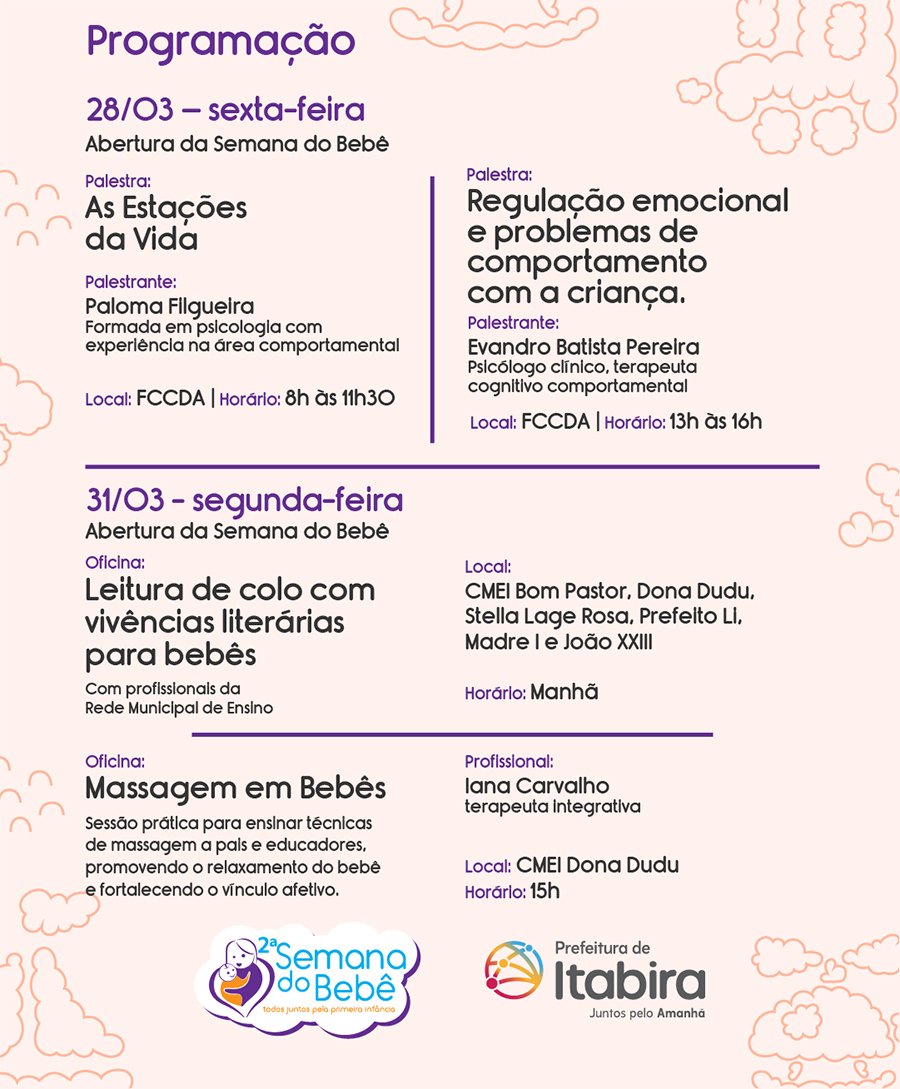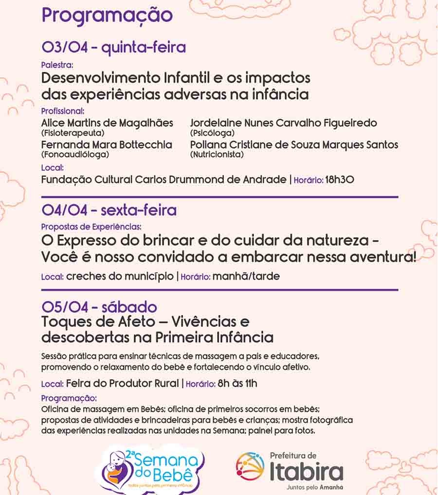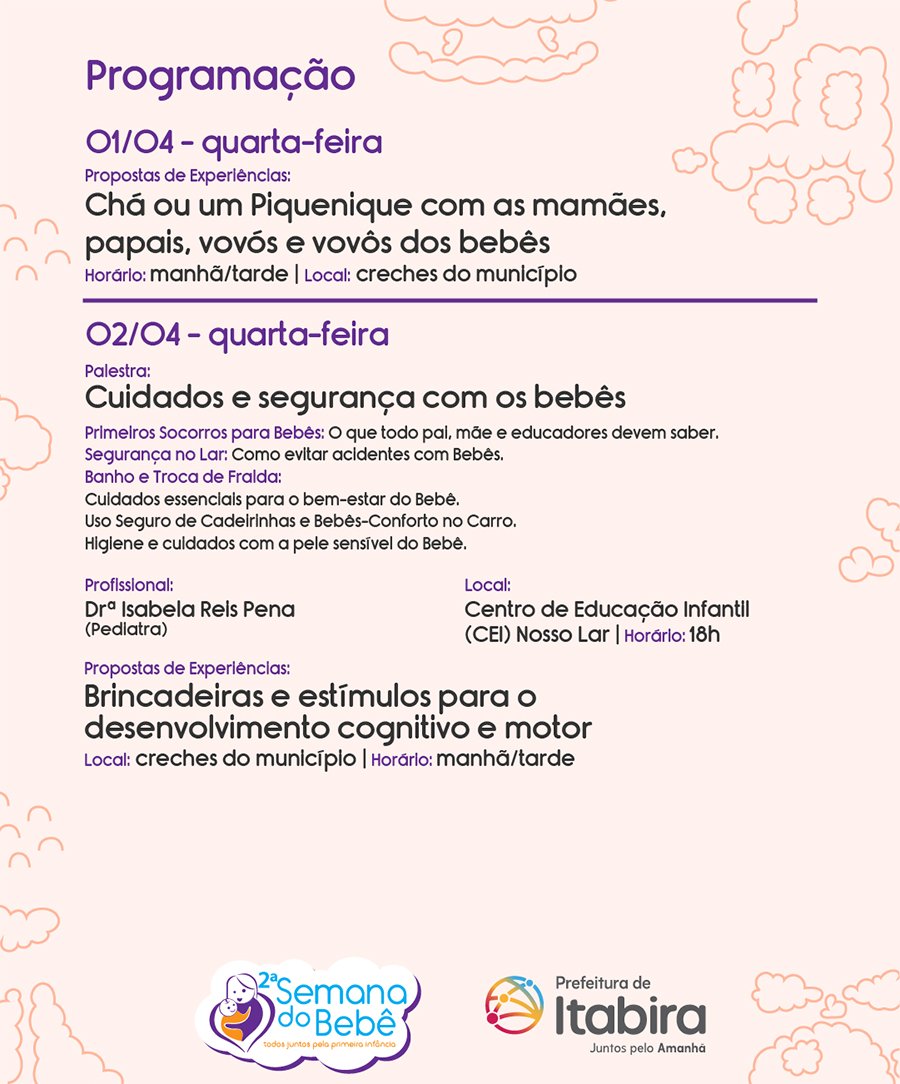 ITABIRA (MG) – Para fortalecer os cuidados integrais com a saúde, educação e proteção das crianças nos primeiros anos de vida, a Prefeitura de Itabira, por meio da Secretaria Municipal de Educação (SME) realiza a 2ª Semana do Bebê. A iniciativa visa assegurar a atenção adequada às crianças, tornando o direito à sobrevivência e ao desenvolvimento como prioridades para o município. Com palestras, oficinas, atividades lúdicas e culturais o evento promove um maior vínculo entre a comunidade escolar e as famílias.