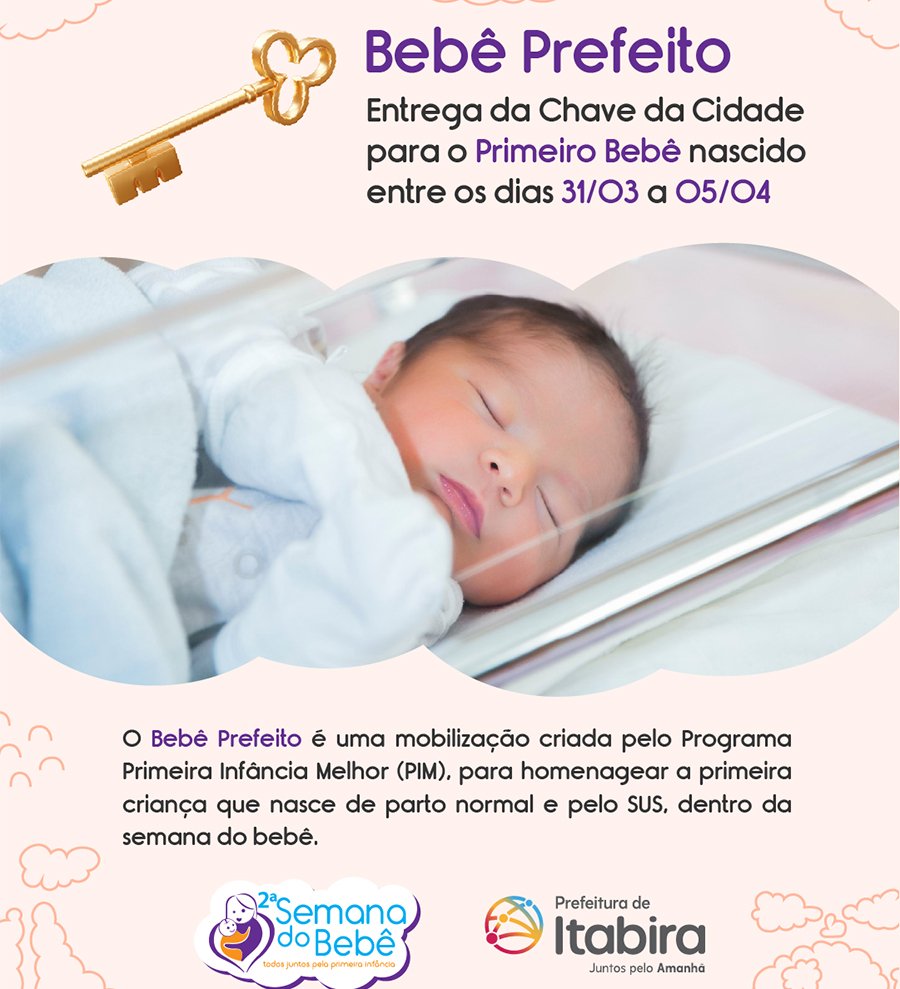 Bebê Prefeito – Dentre as atividades a SME prepara a entrega da “Chave da Cidade” para o primeiro bebê nascido entre os dias 31 de março de 2025 a 5 de abril . A atividade denominada “Bebê Prefeito” é uma mobilização criada pelo Programa Primeira Infância Melhor (PIM), para homenagear a primeira criança que nasce de parto normal e pelo SUS, dentro da semana do bebê. Vamos juntos fortalecer esse momento especial. Veja a programação completa: