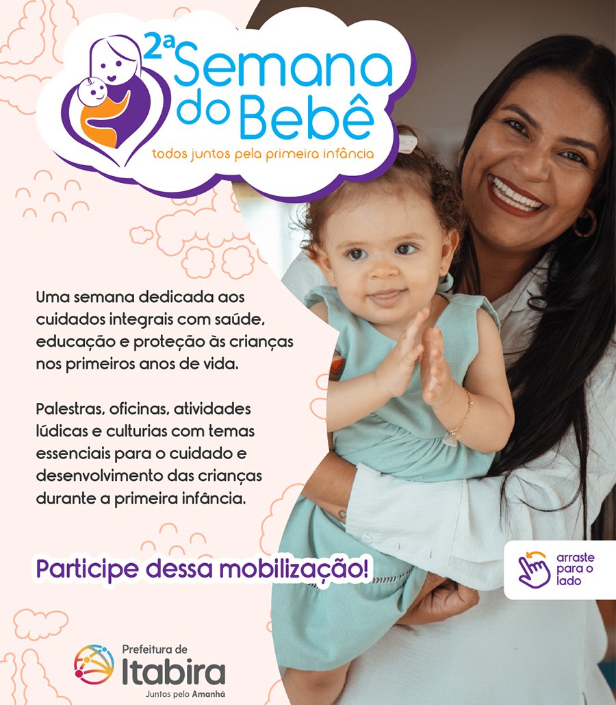 ITABIRA (MG) – Para fortalecer os cuidados integrais com a saúde, educação e proteção das crianças nos primeiros anos de vida, a Prefeitura de Itabira, por meio da Secretaria Municipal de Educação (SME) realiza a 2ª Semana do Bebê. A iniciativa visa assegurar a atenção adequada às crianças, tornando o direito à sobrevivência e ao desenvolvimento como prioridades para o município. Com palestras, oficinas, atividades lúdicas e culturais o evento promove um maior vínculo entre a comunidade escolar e as famílias.