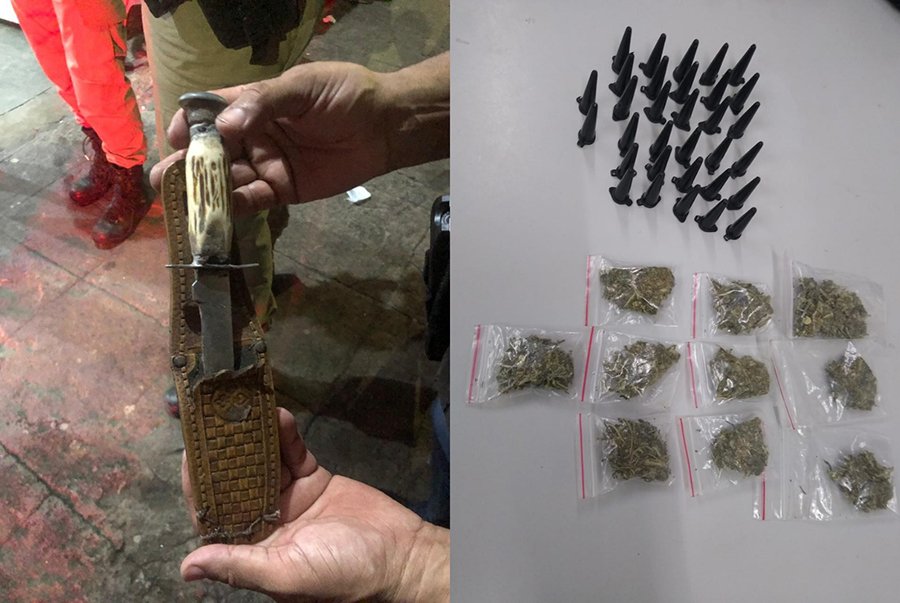 Policias militares conferiram documentação dos veículos, além de realizar busca pessoal em suspeitos. Ocorreu prisão em flagrante por suspeita de tráfico de drogas (posse de cocaína e maconha). Uma faca foi localizada na cintura do cliente em um bar, sendo lavrado o Termo Circunstanciado de Ocorrência (TCO), além do objeto apreendido.