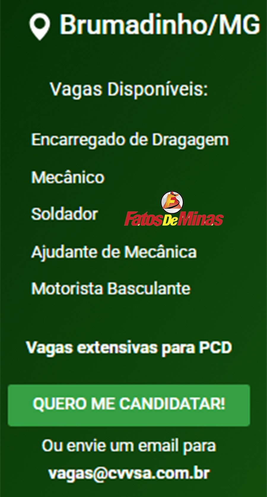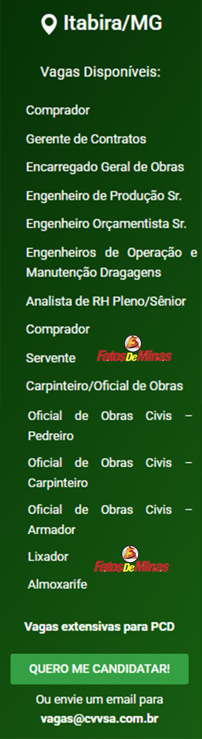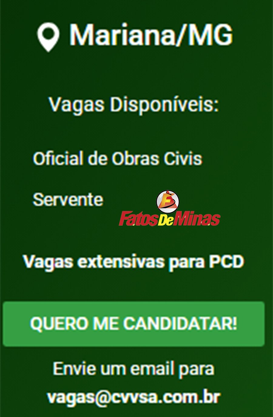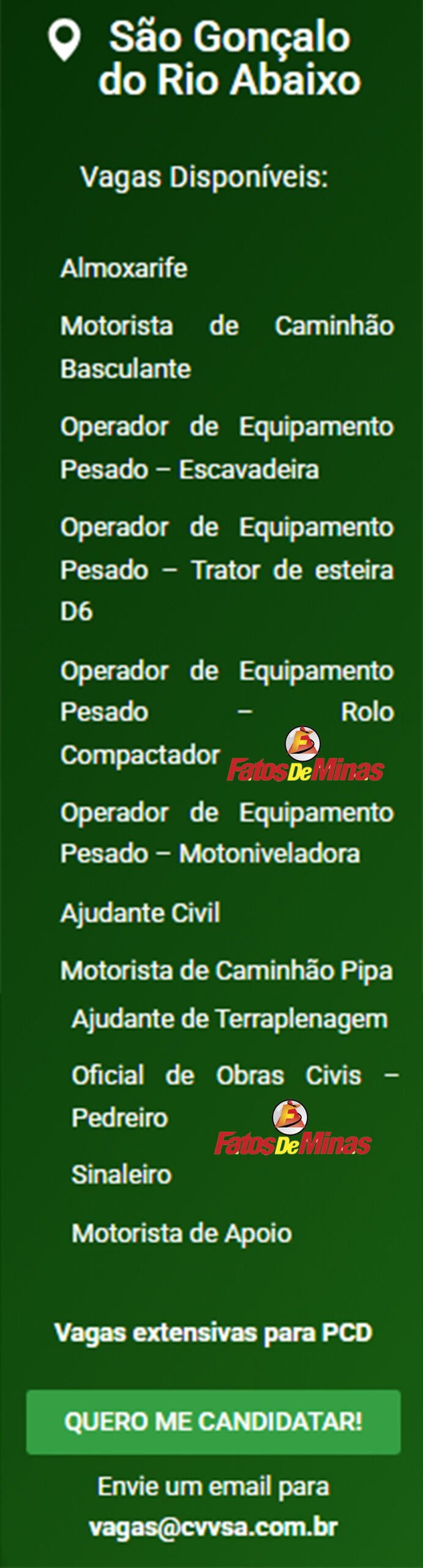 ATENÇÃO: Os interessados pelas vagas devem enviar currículo para o email: vagas@cvvsa.com.br