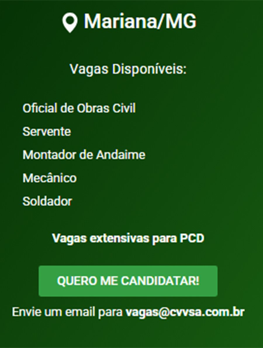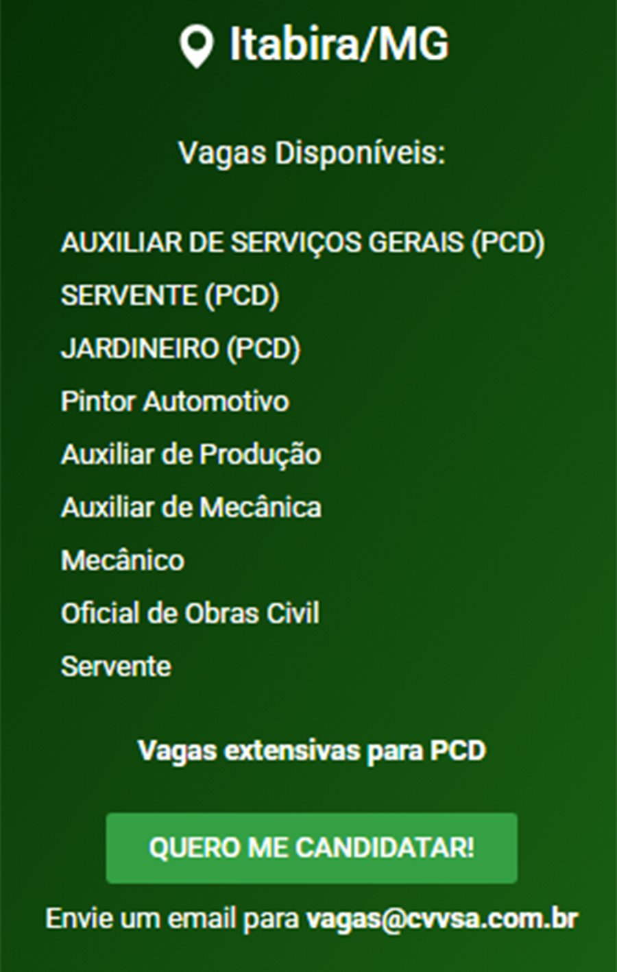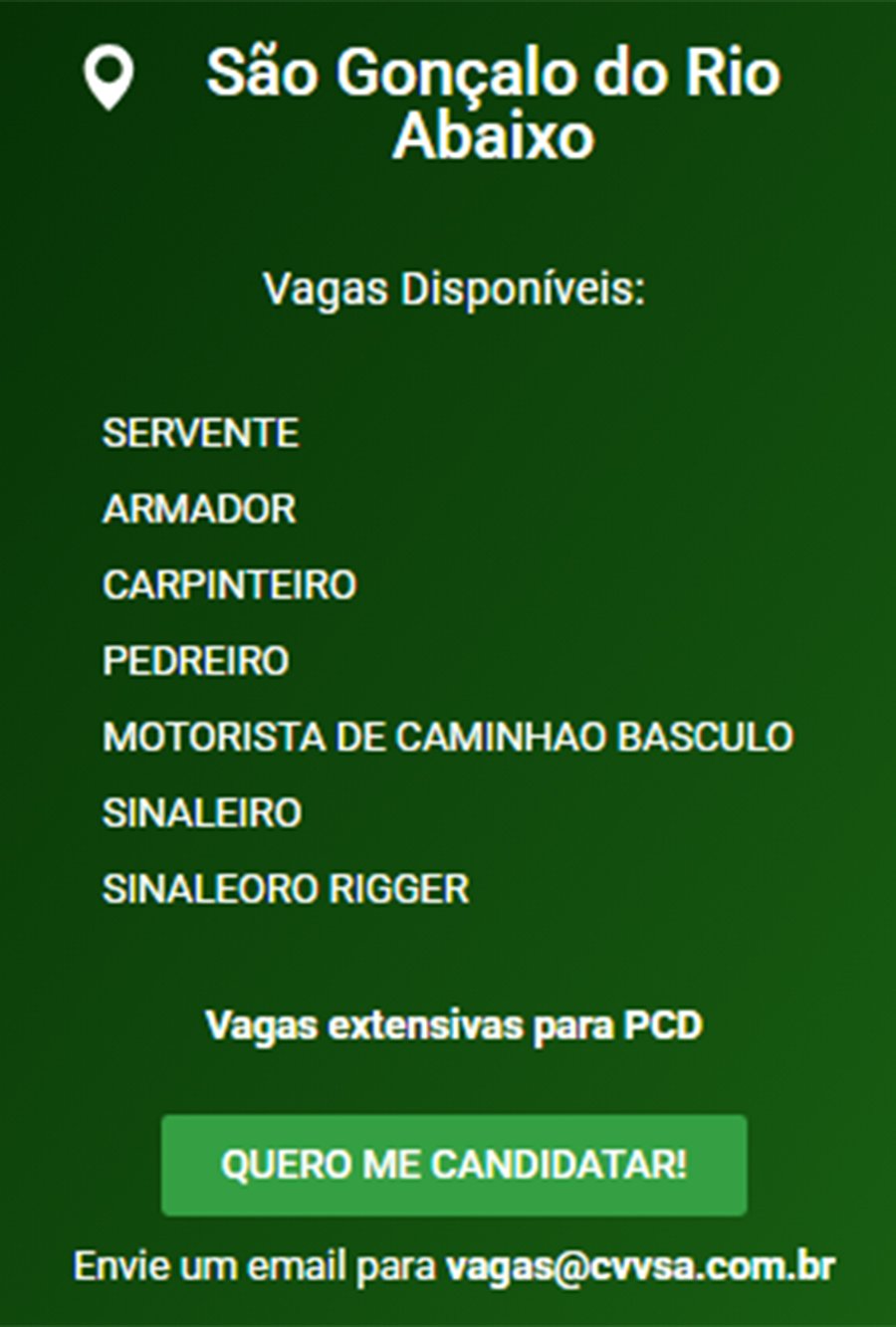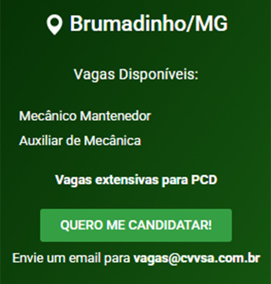 ATENÇÃO: Os interessados pelas vagas devem enviar currículo para o email: vagas@cvvsa.com.br