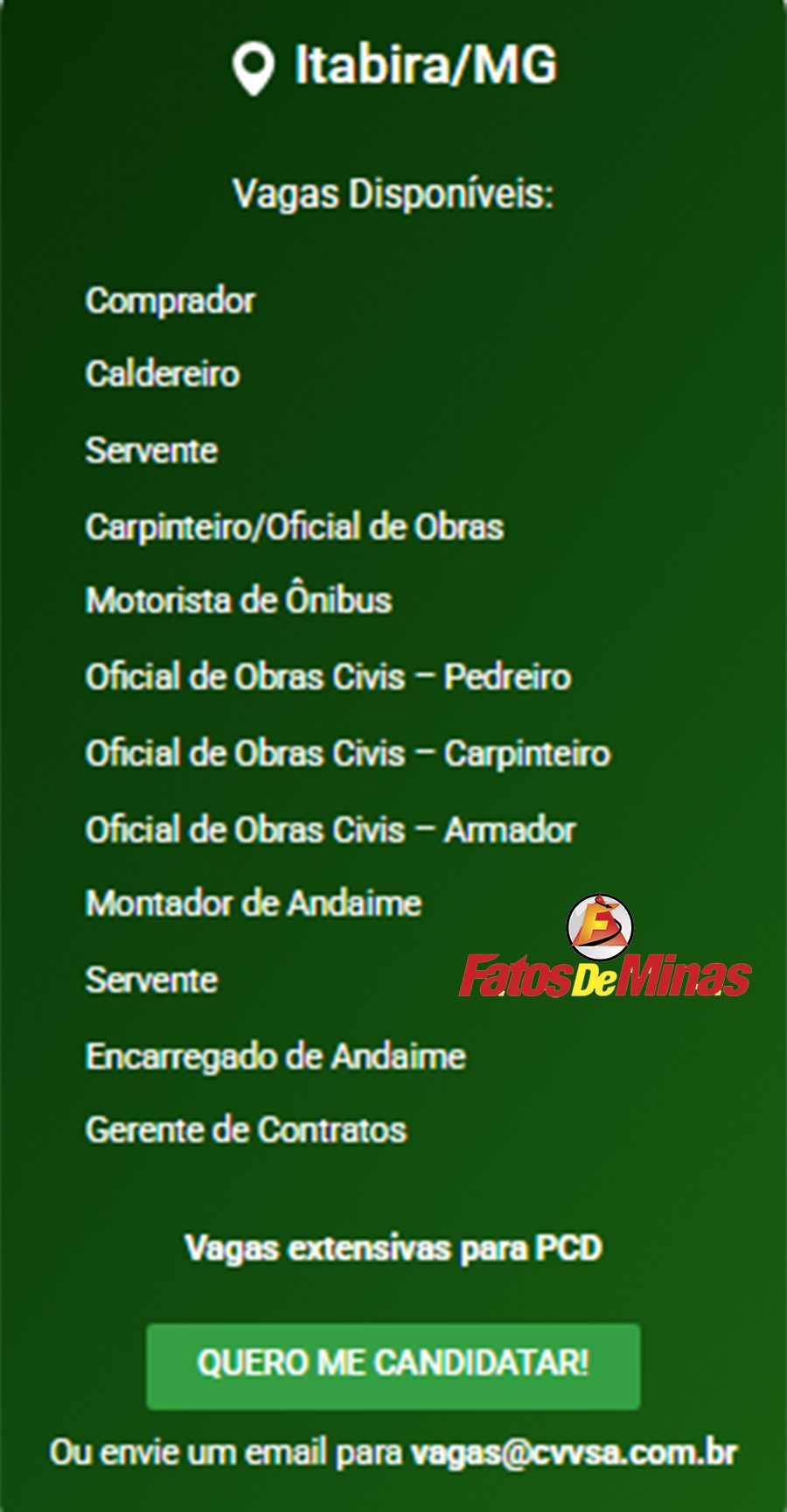ATENÇÃO: Os interessados pelas vagas devem enviar currículo para o email: vagas@cvvsa.com.br
