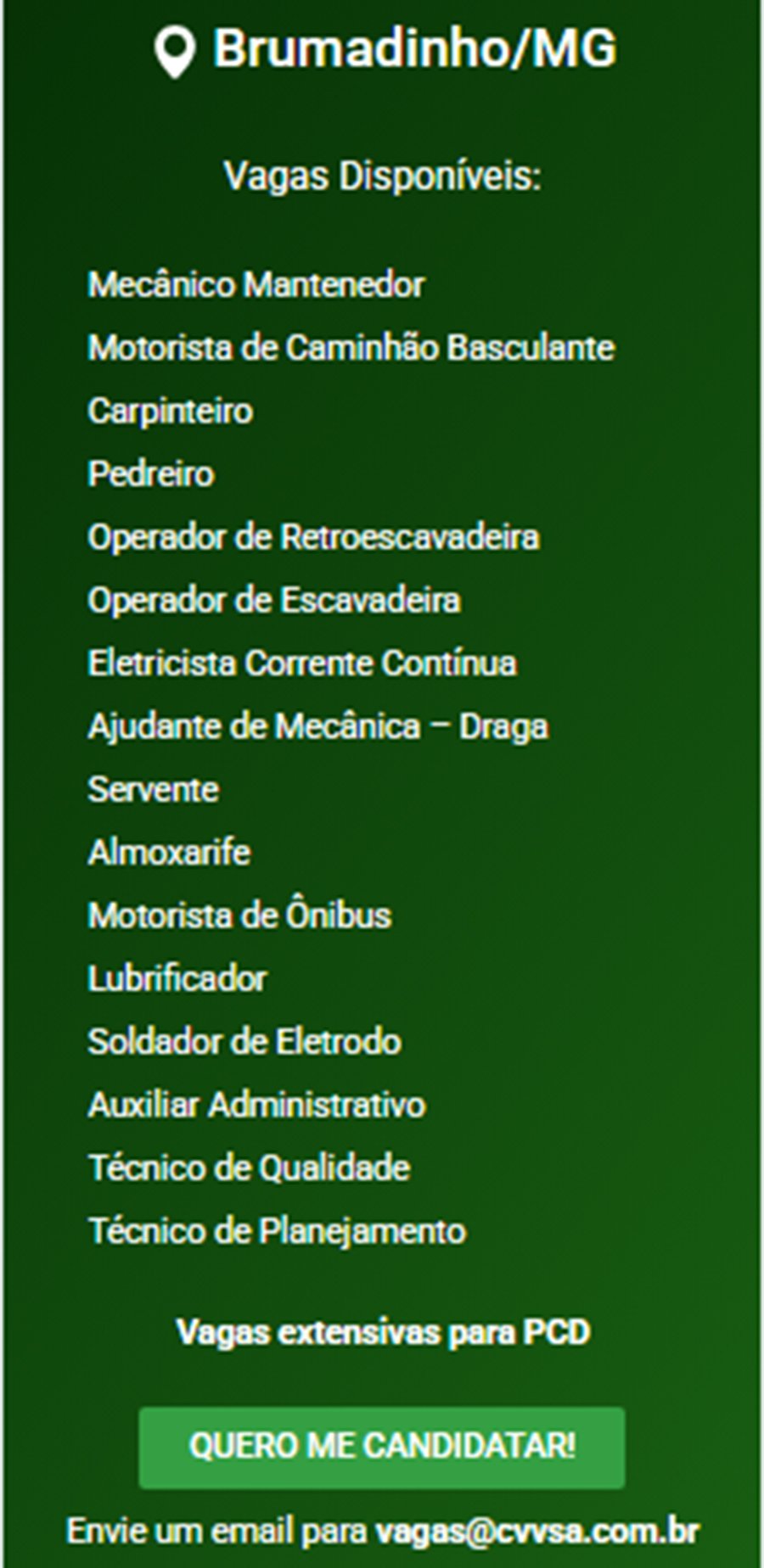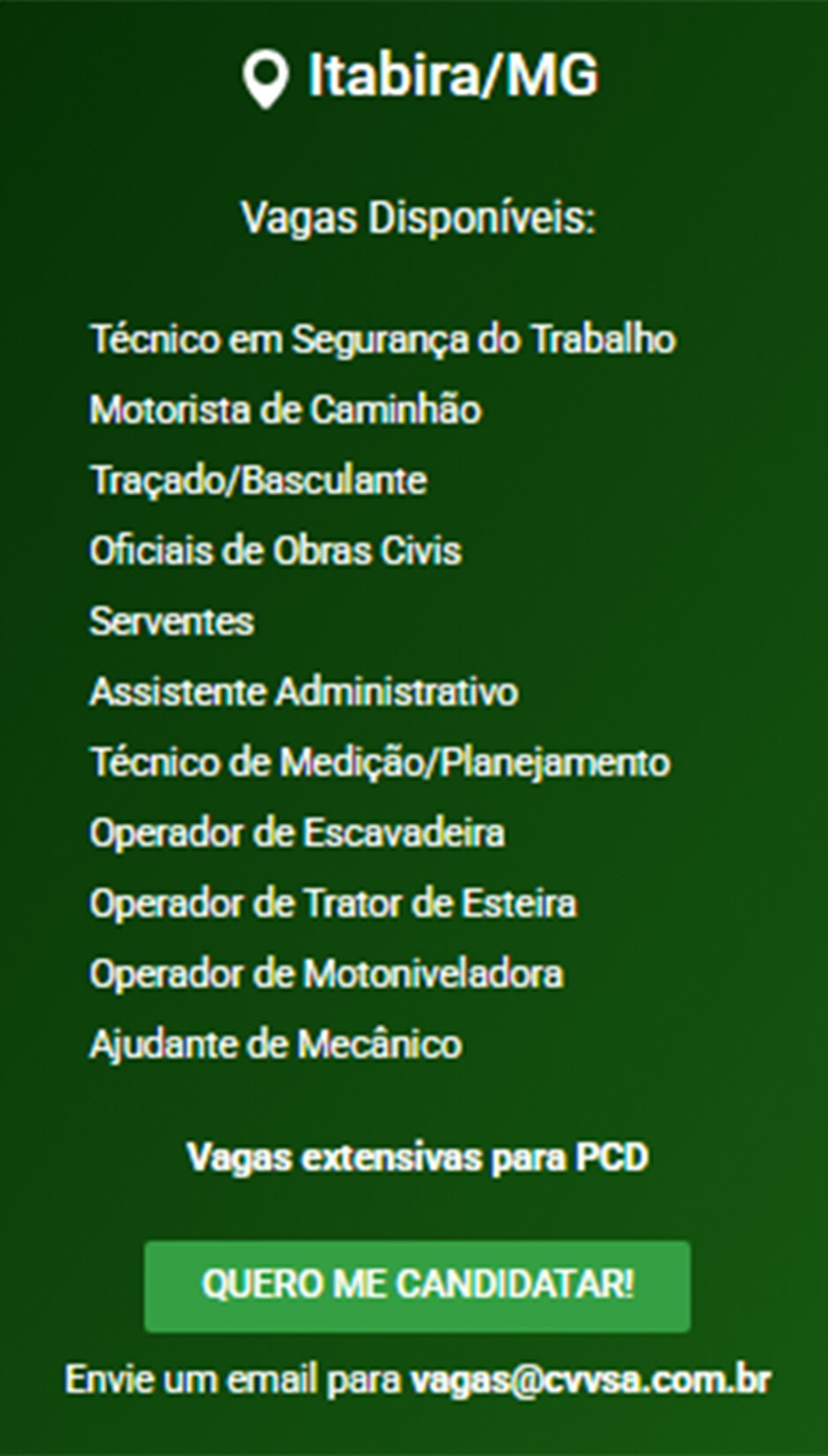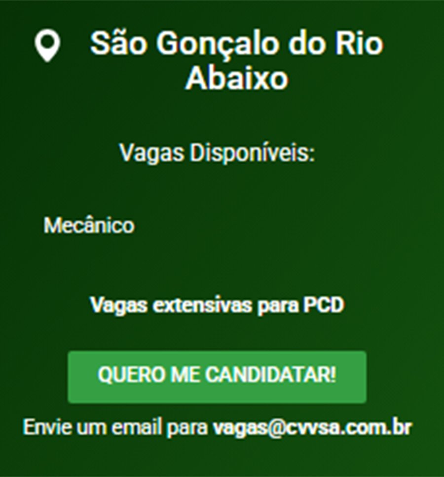 ATENÇÃO: Os interessados pelas vagas devem enviar currículo para o email: vagas@cvvsa.com.br
