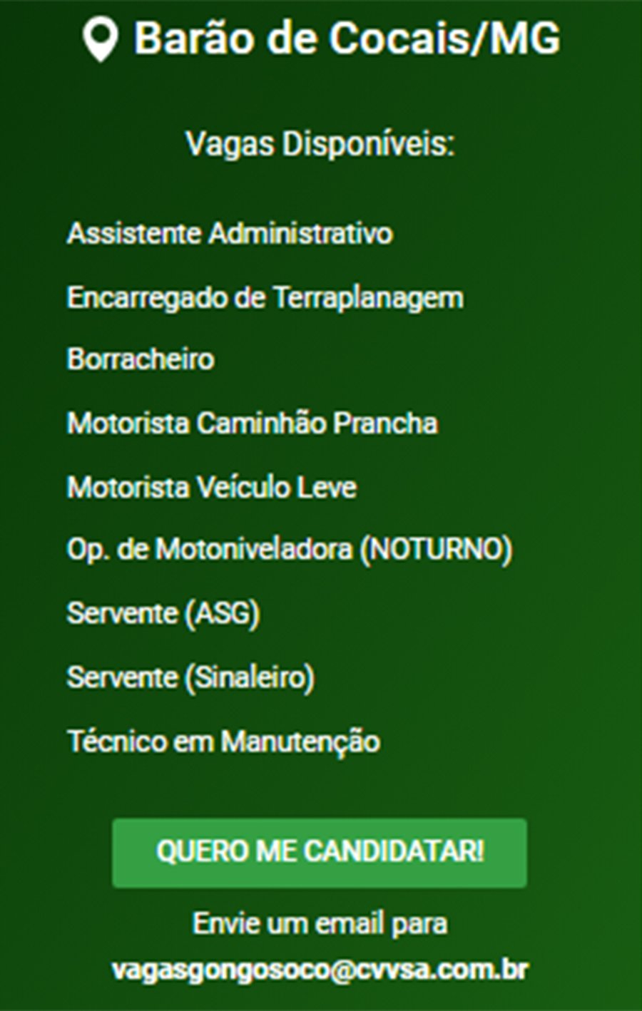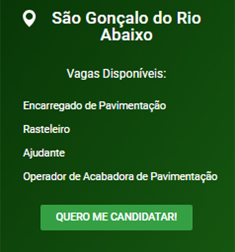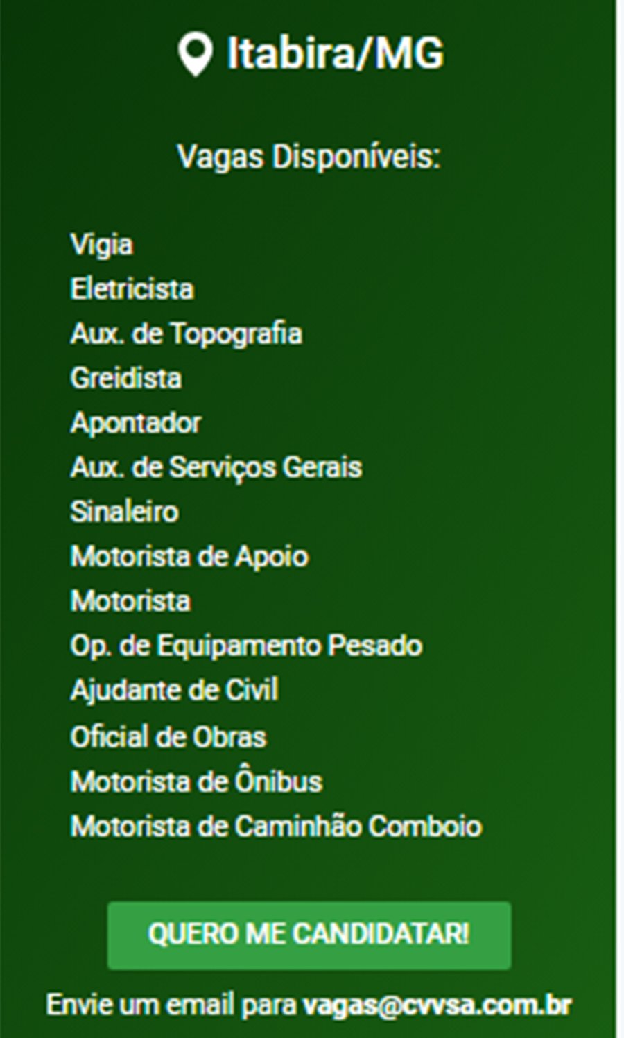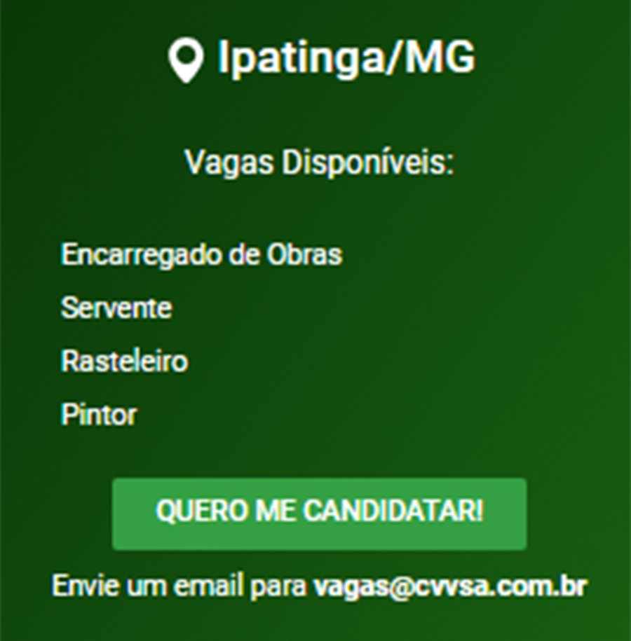 OPORTUNIDADE Confira as vagas de emprego disponíveis na construtora Vale Verde para Itabira, São Gonçalo, Barão de Cocais e Ipatinga
