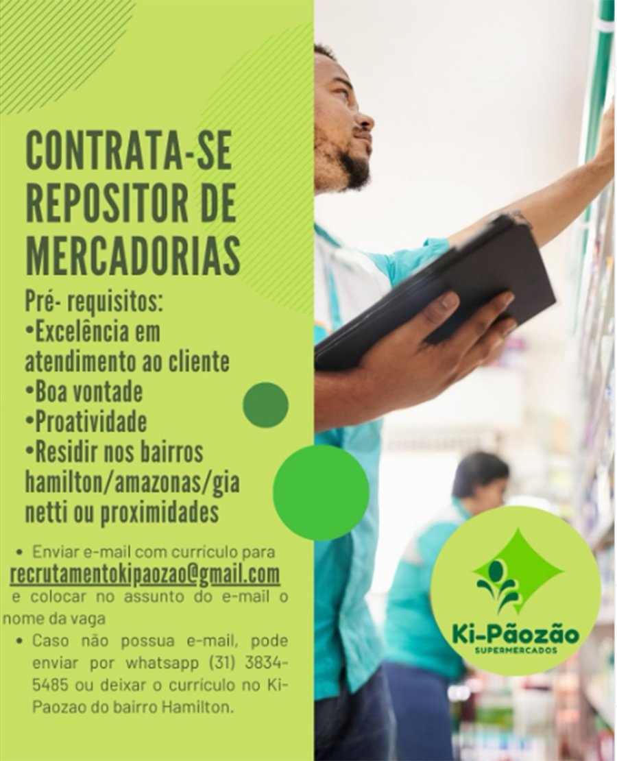 ATENÇÃO – Os interessados no emprego, devem enviar currículo para o email recrutamentokipaozao@gmail.com, colocando o assunto e o nome da vaga de emprego. O interessado a vaga de emprego também pode deixar o currículo na sede o supermercado na rua João Camilo de Oliveira Torres, no bairro Praia.