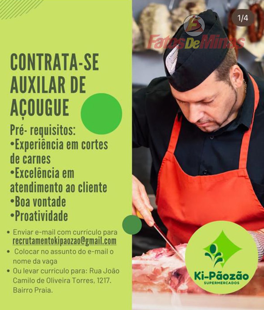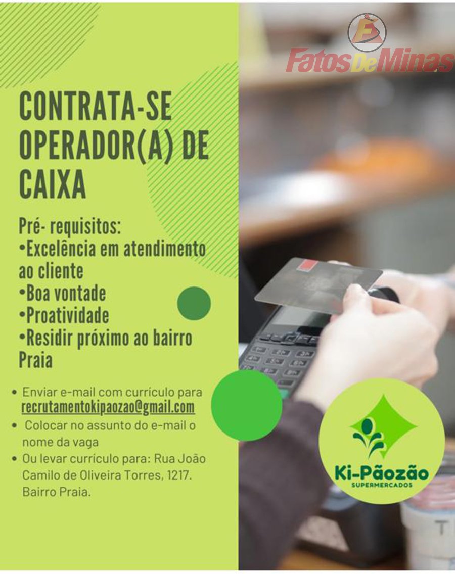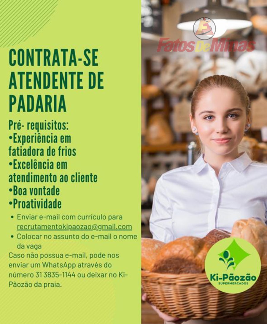 ATENÇÃO – Os interessados no emprego, devem enviar currículo para o email recrutamentokipaozao@gmail.com, colocando o assunto e o nome da vaga de emprego. O interessado a vaga de emprego também pode deixar o currículo na sede o supermercado na rua João Camilo de Oliveira Torres, no bairro Praia.