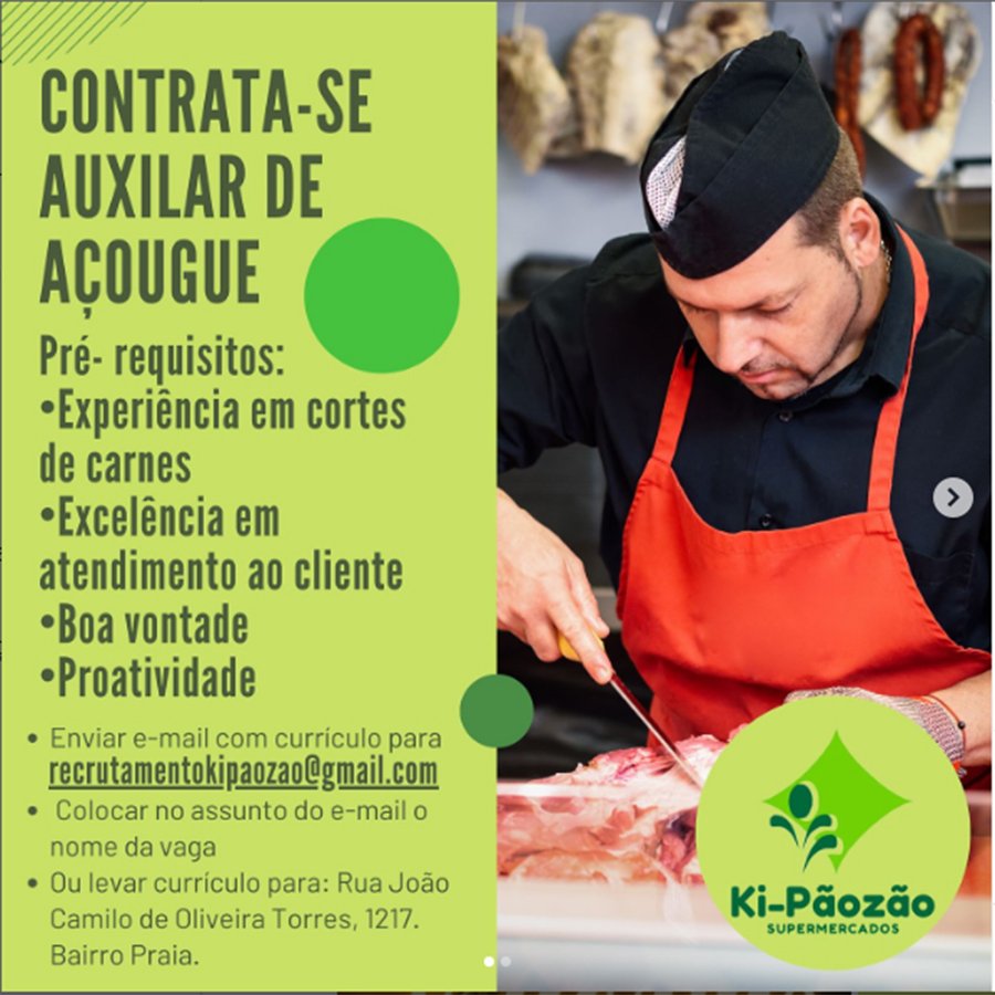 ATENÇÃO – Os interessados no emprego, devem enviar currículo para o email recrutamentokipaozao@gmail.com Colocando o assunto e o nome da vaga de emprego.