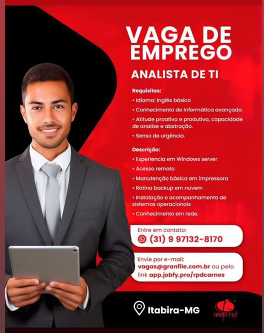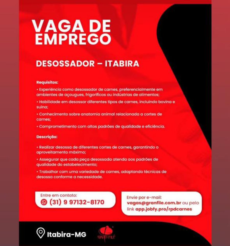 As pessoas interessadas na divulgação, deverão encaminhar os dados da vaga para o e-mail vagas@granfile.com.br com o nome da vaga no assunto do e-mail.
