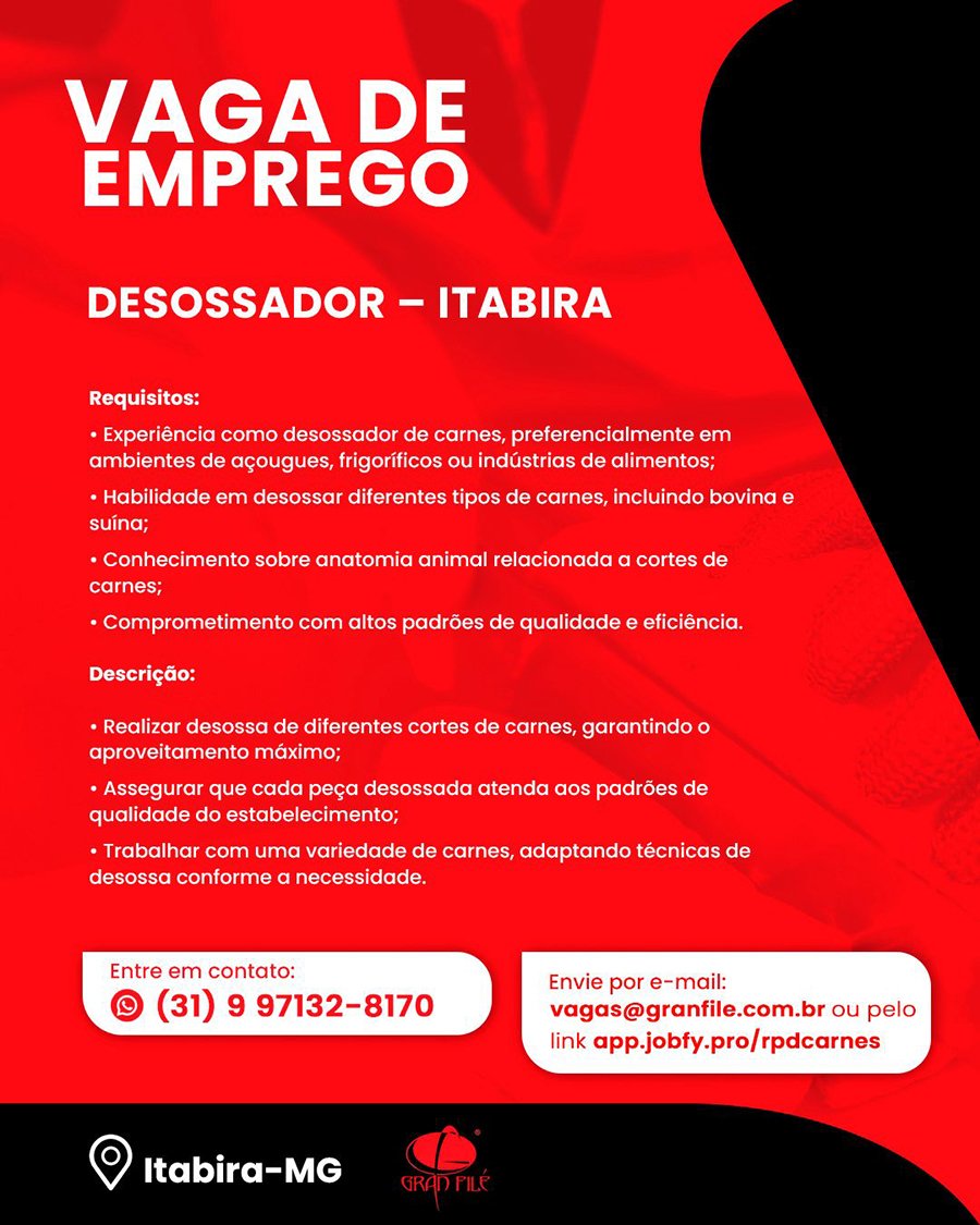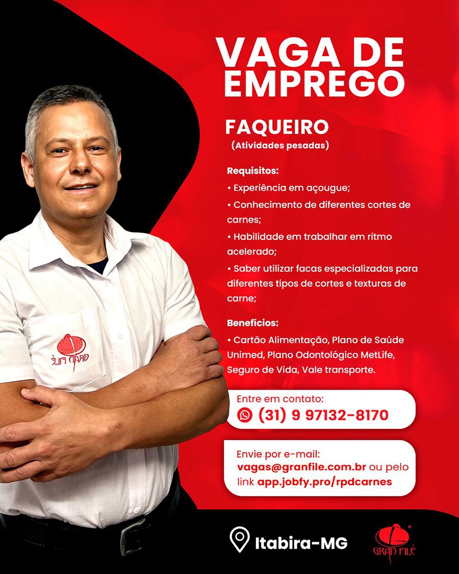 As pessoas interessadas na divulgação, deverão encaminhar os dados da vaga para o e-mail vagas@granfile.com.br com o nome da vaga no assunto do e-mail.
