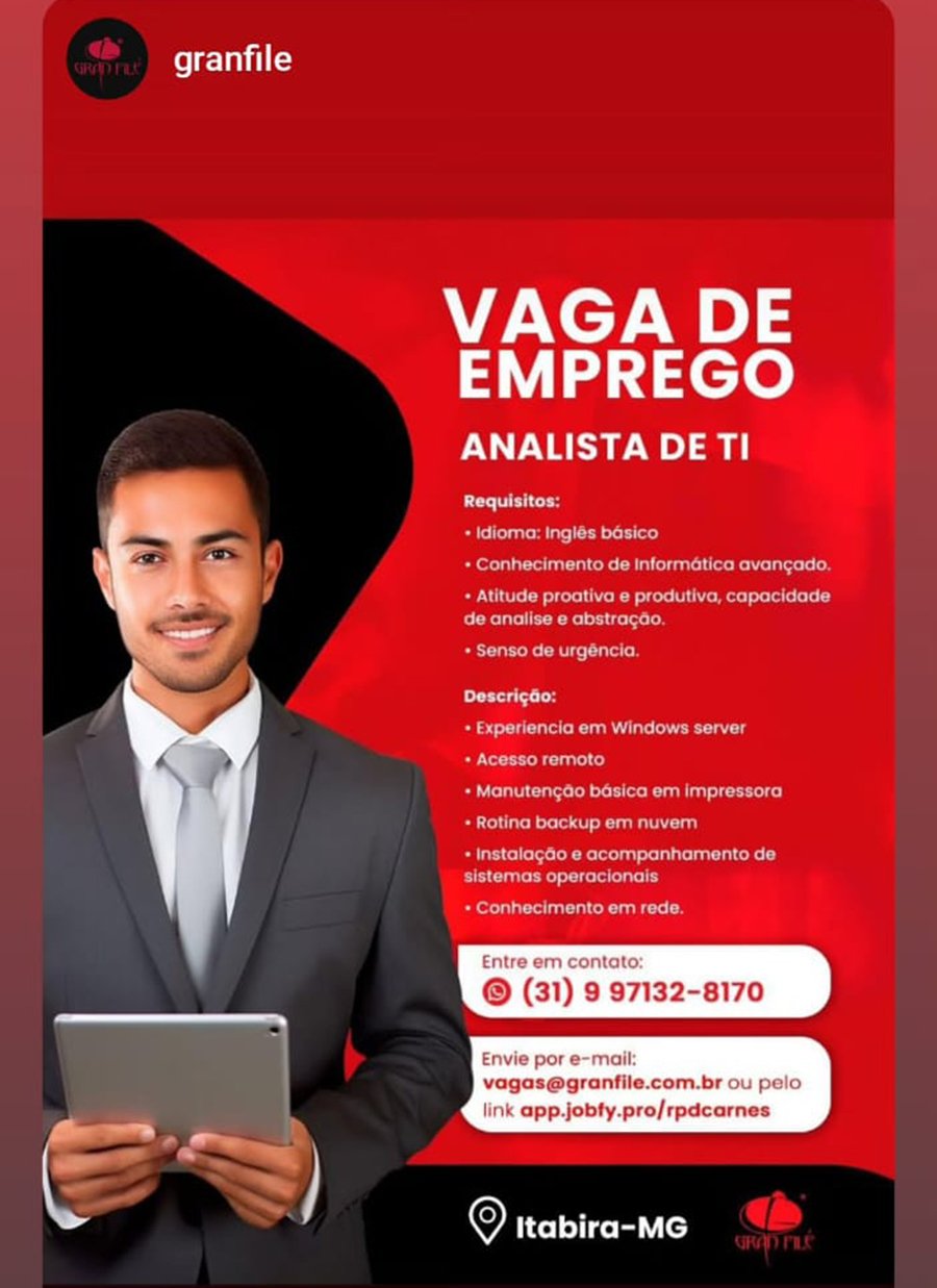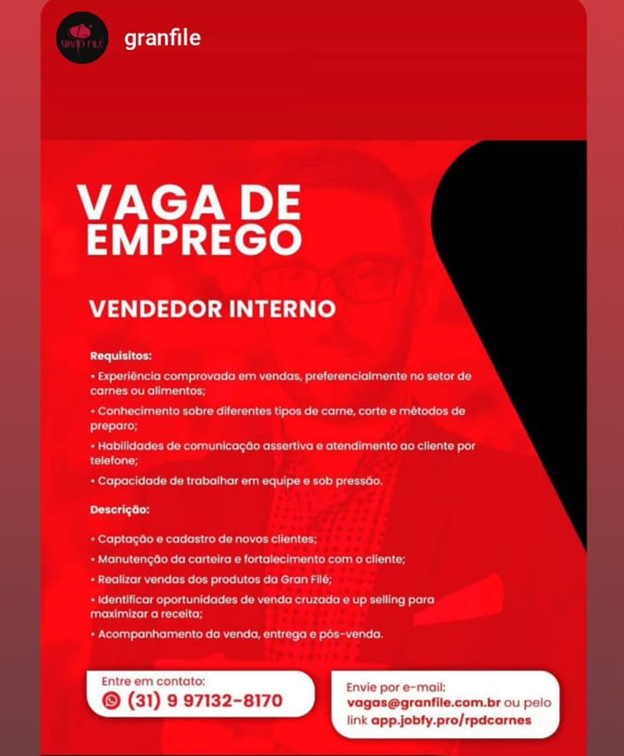 As pessoas interessadas na divulgação, deverão encaminhar os dados da vaga para o e-mail vagas@granfile.com.br com o nome da vaga no assunto do e-mail.