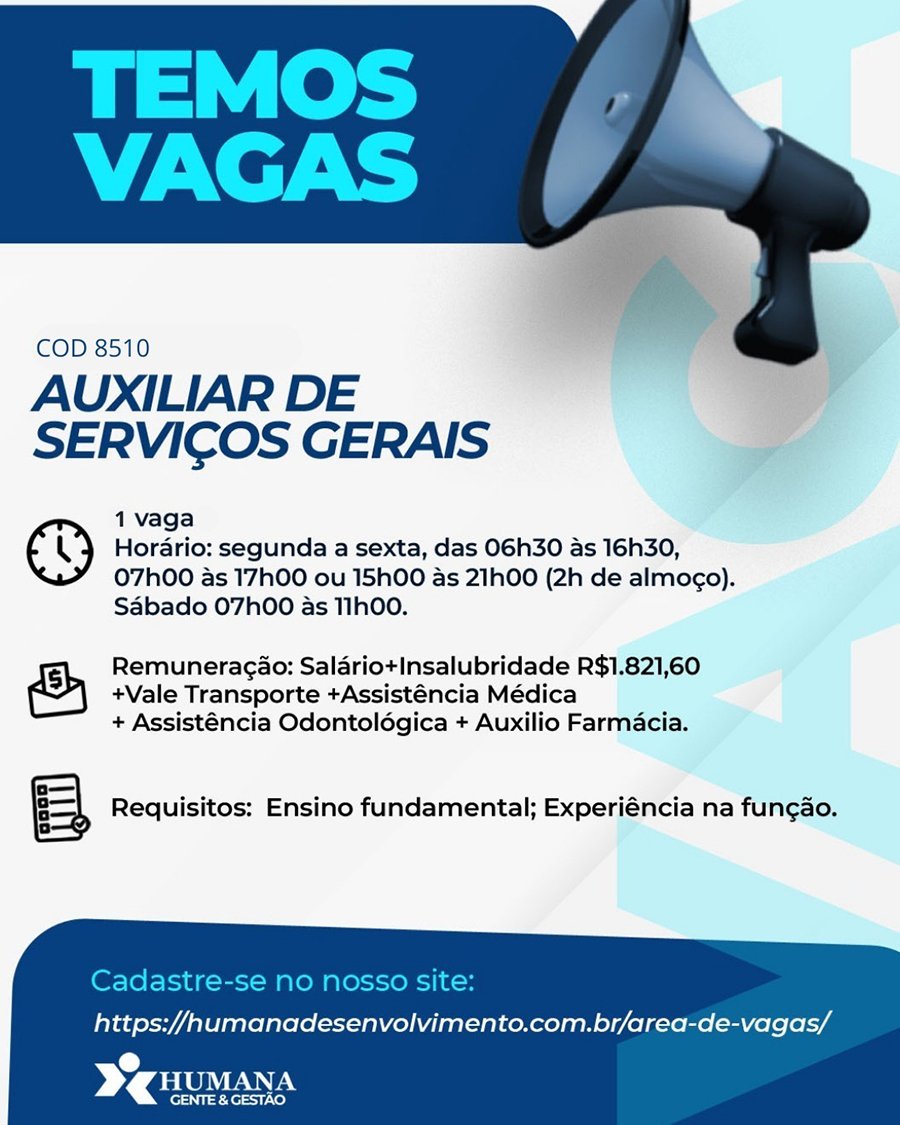 OPORTUNIDADE Confira as vagas de emprego ofertadas pela Humana Desenvolvimento para esta segunda-feira, 19 de janeiro