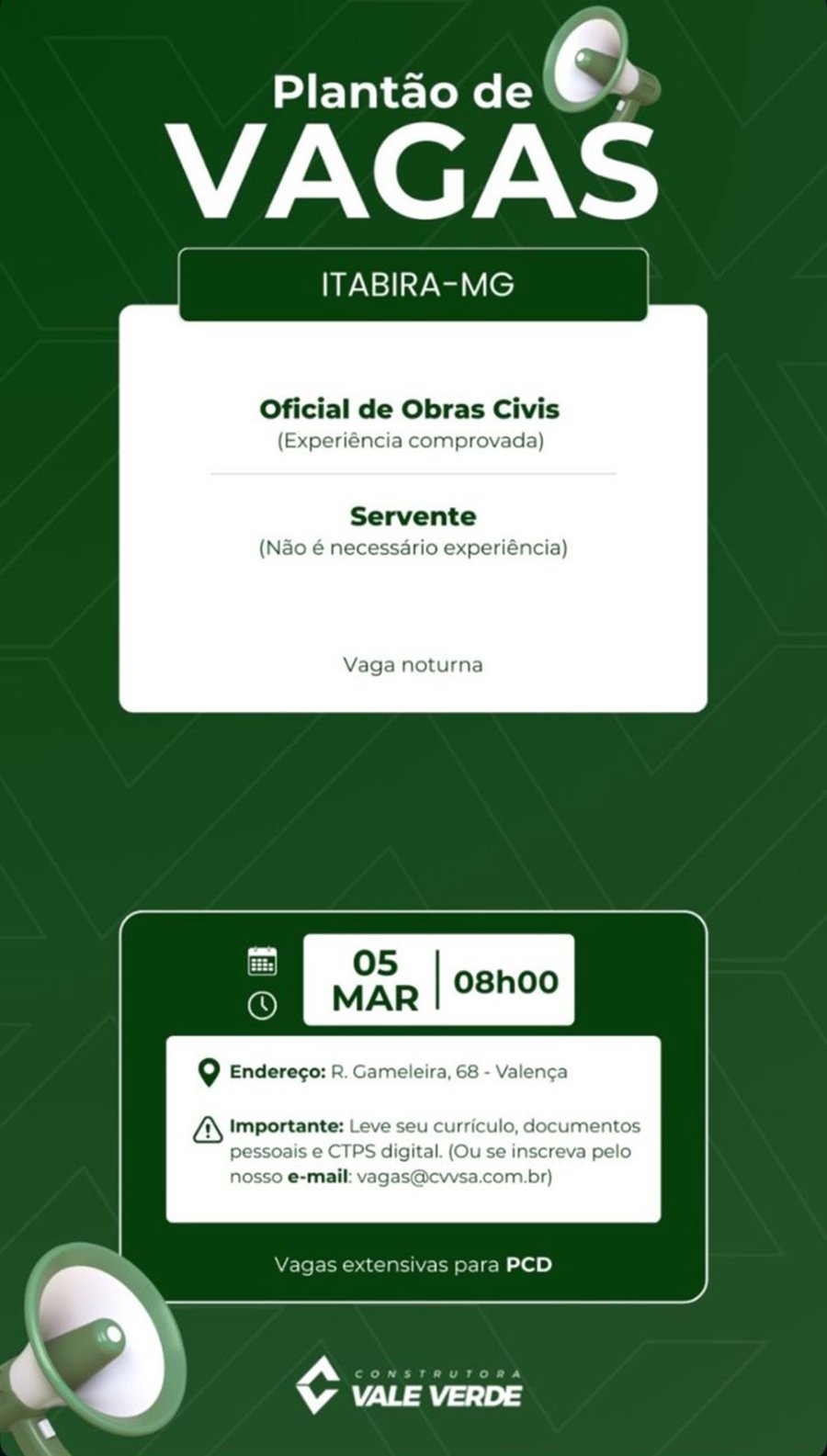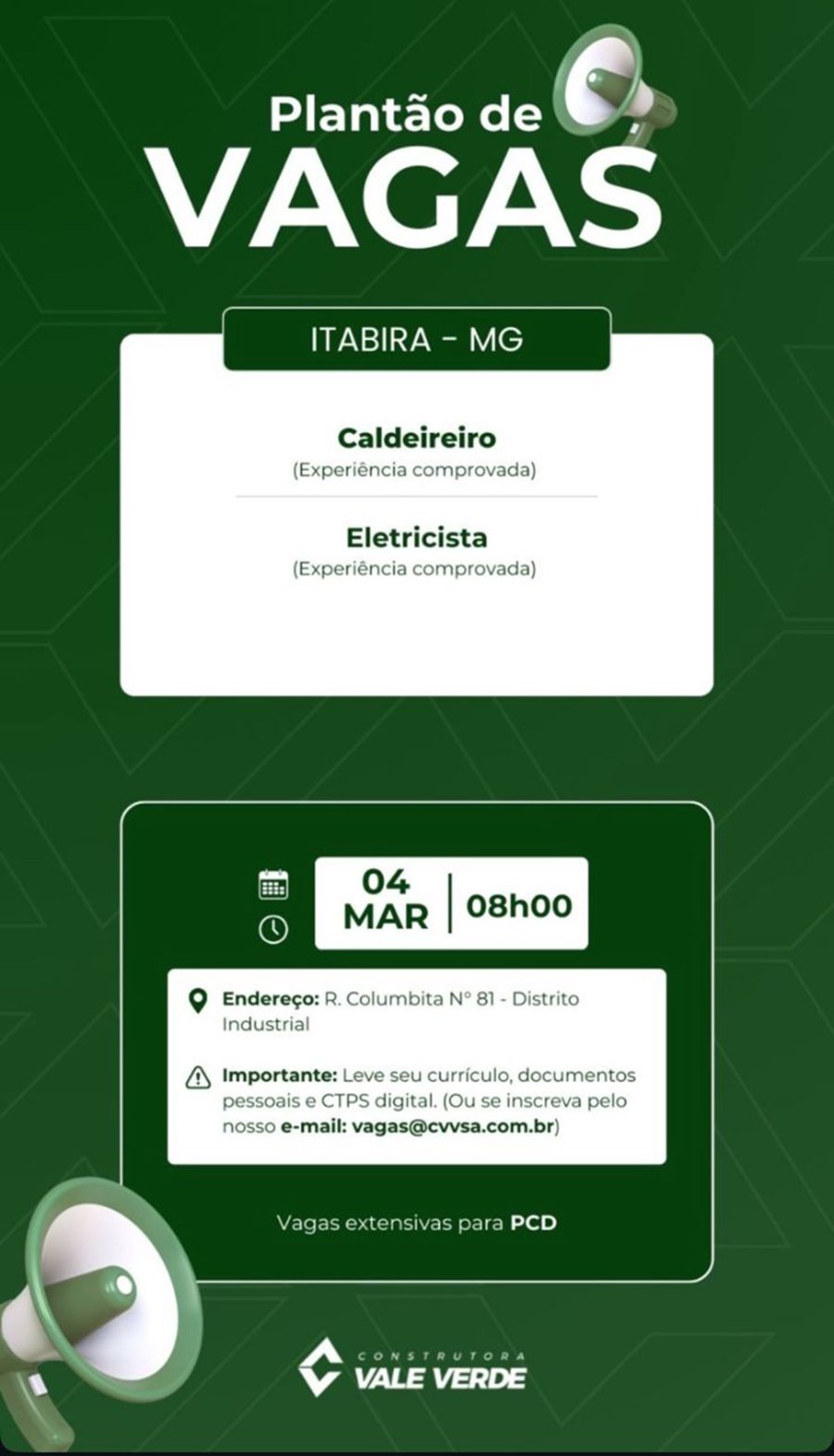 ATENÇÃO: Os interessados pelas vagas devem enviar currículo para o email: vagas@cvvsa.com.br