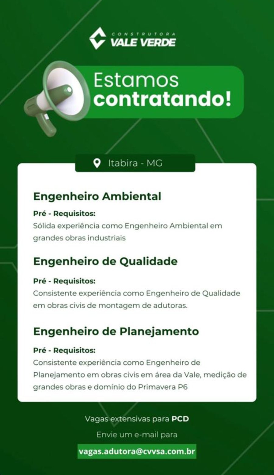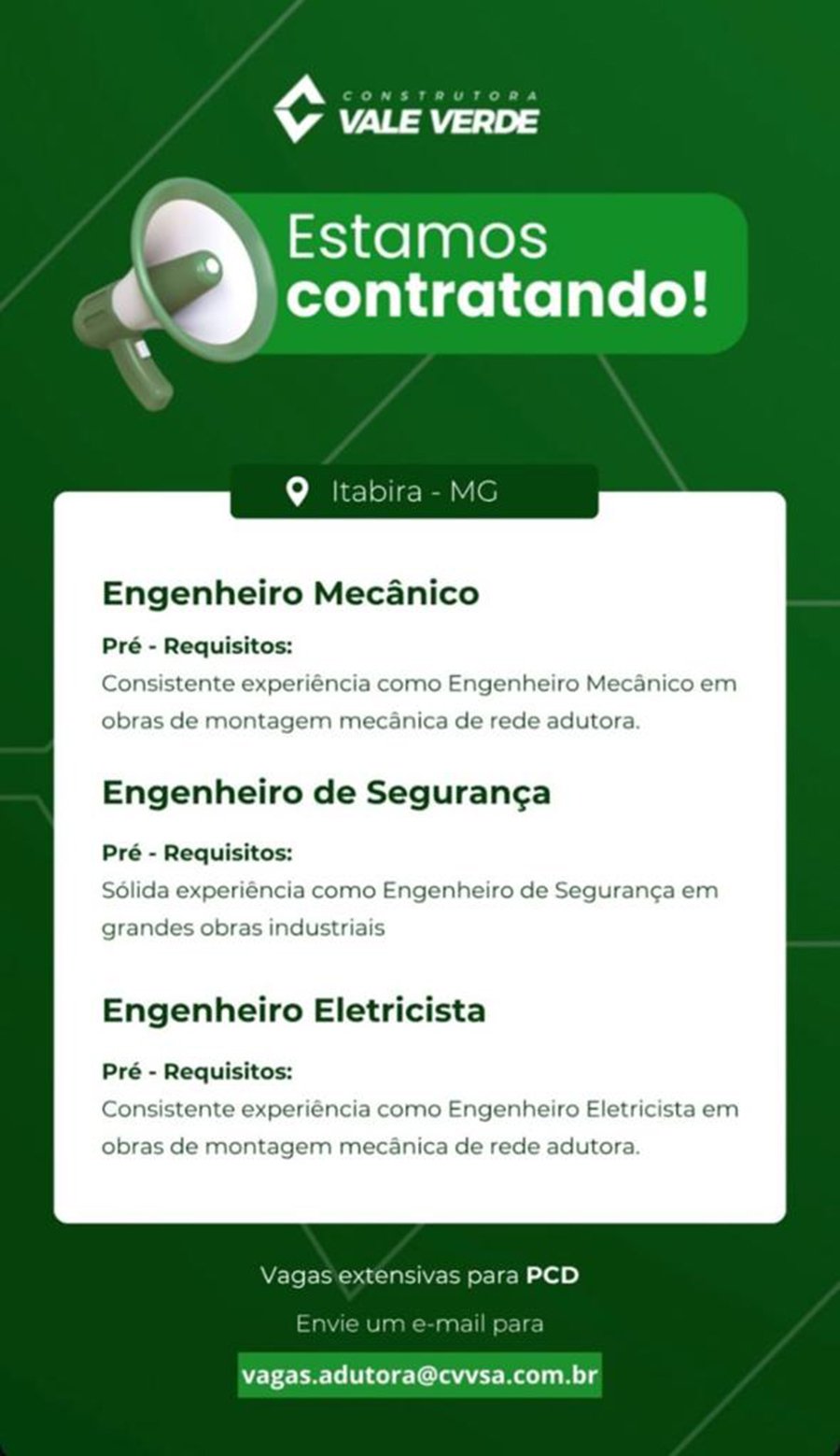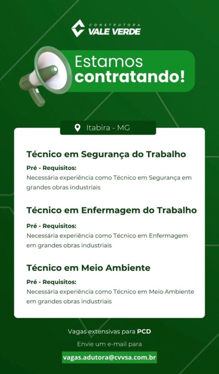 ATENÇÃO: Os interessados pelas vagas devem enviar currículo para o email: vagas@cvvsa.com.br