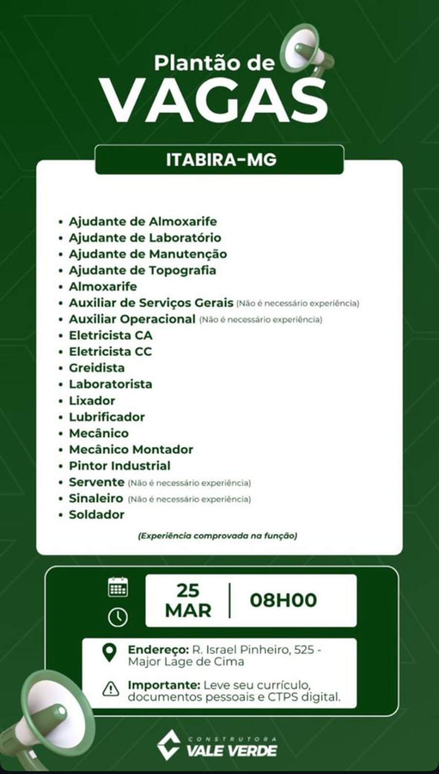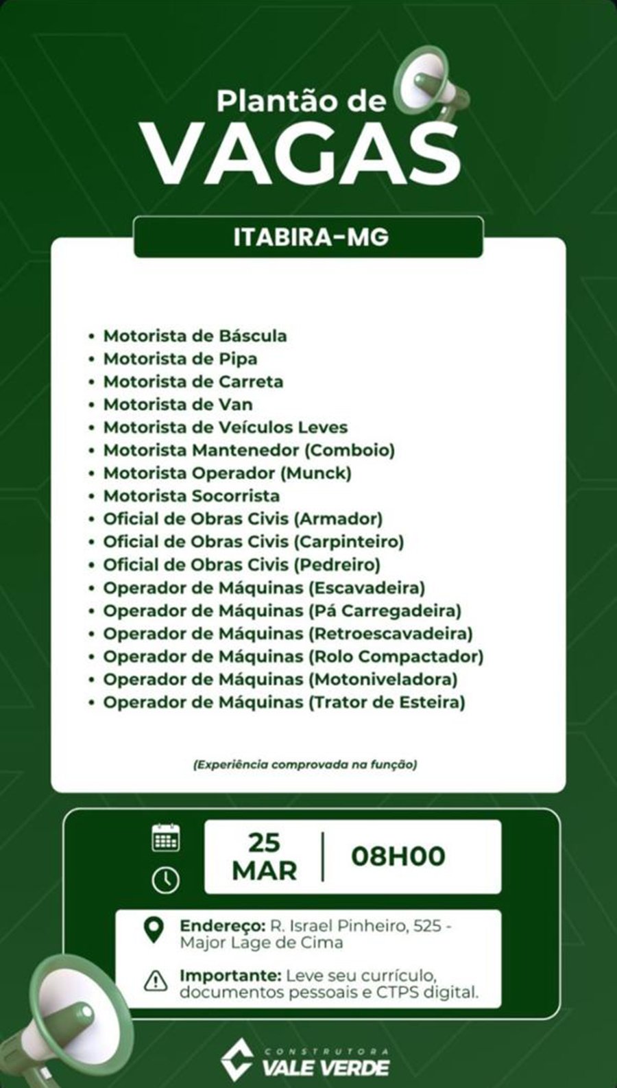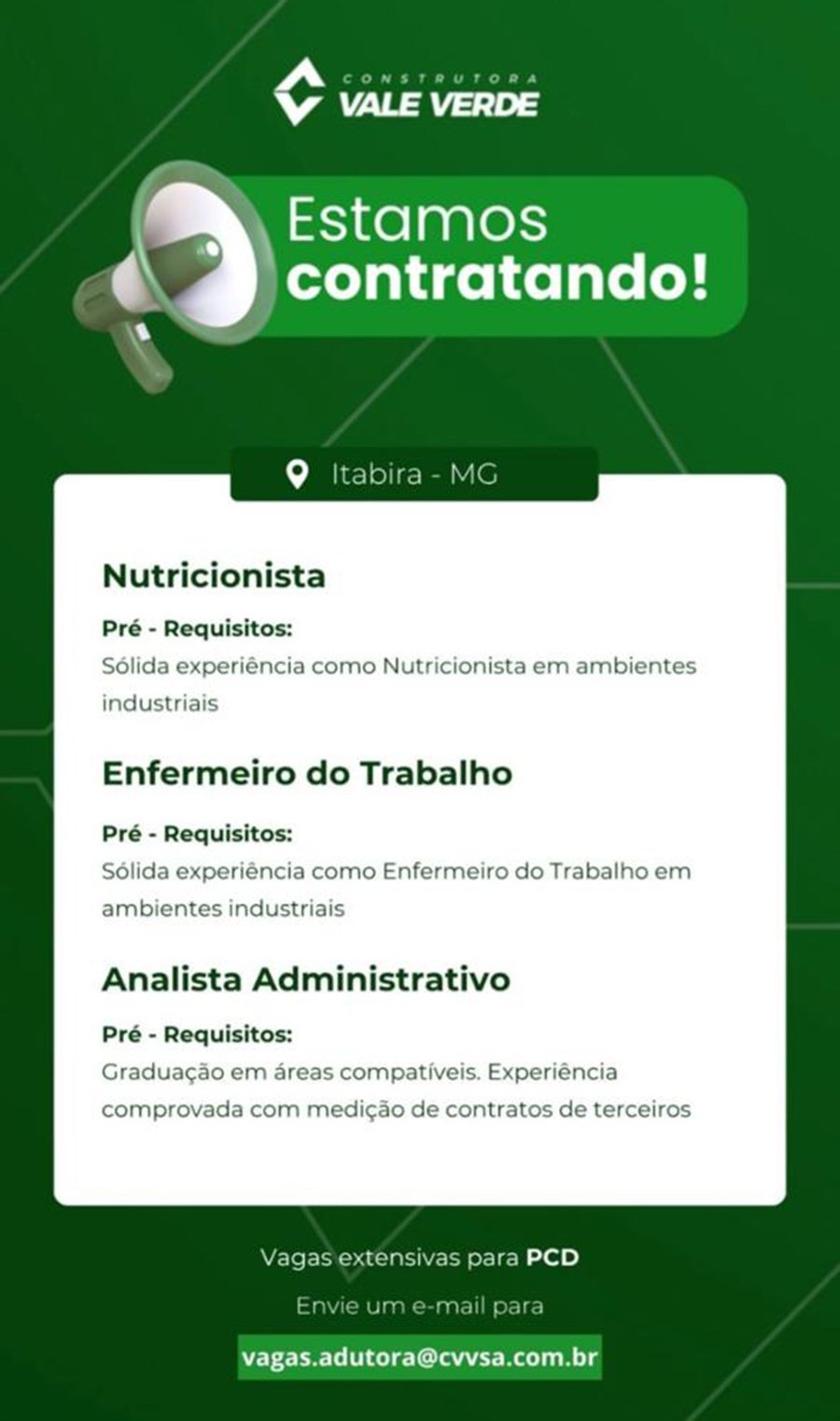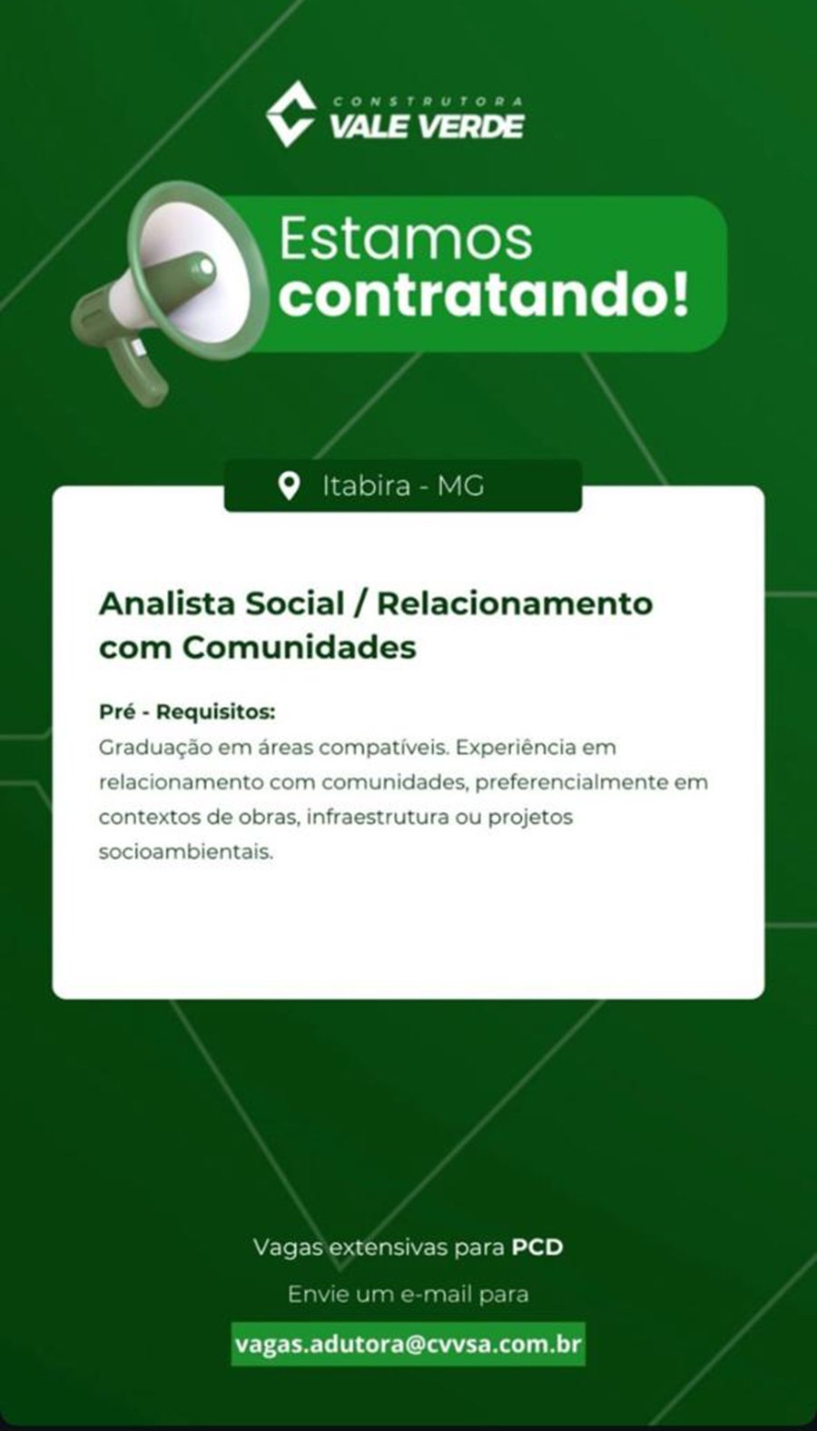 ATENÇÃO: Os interessados pelas vagas devem enviar currículo para o email: vagas@cvvsa.com.br