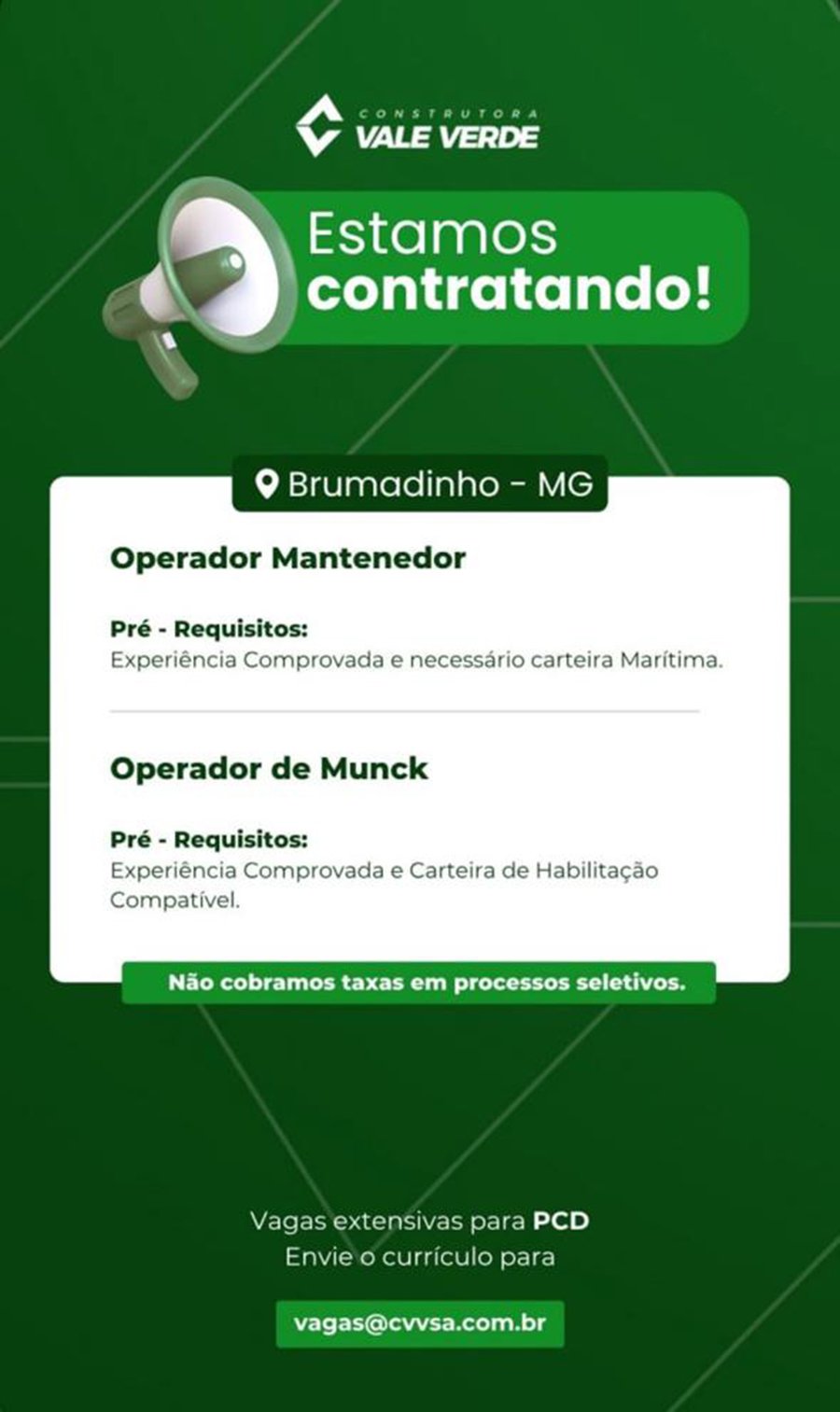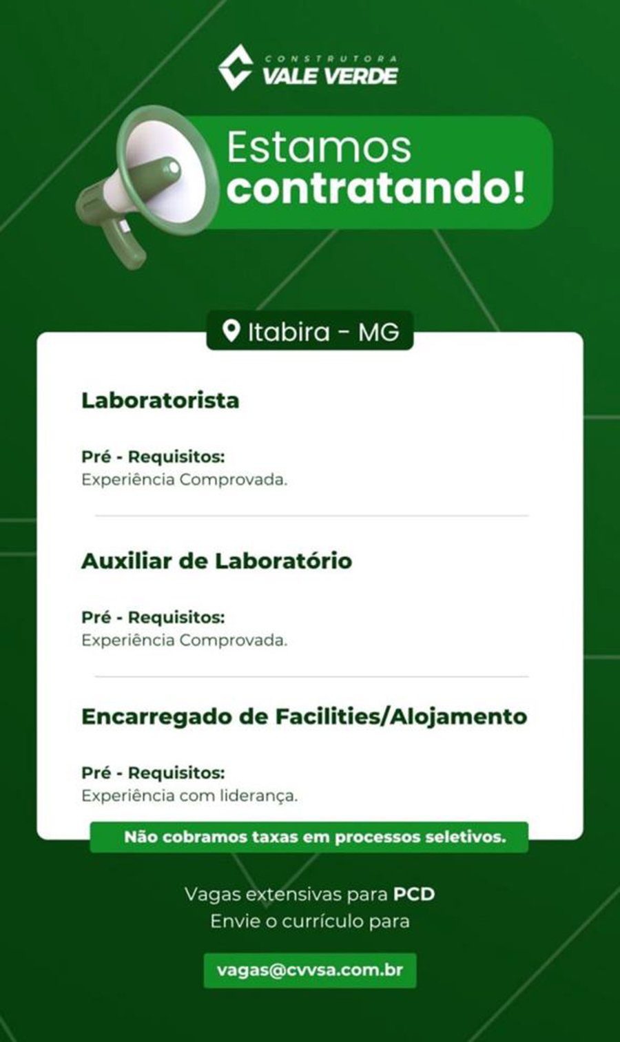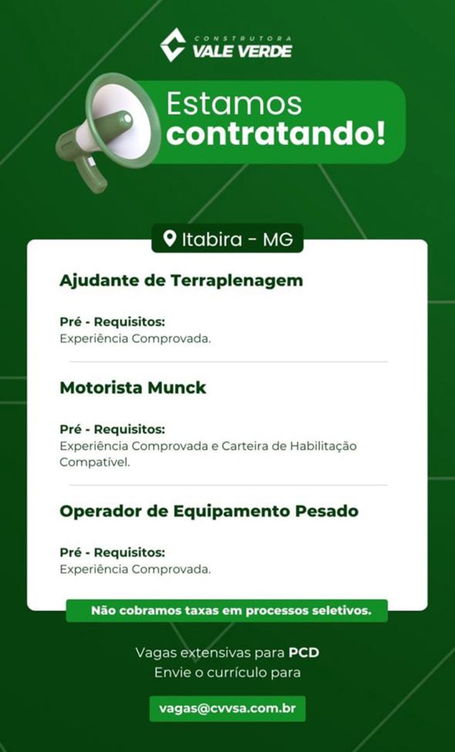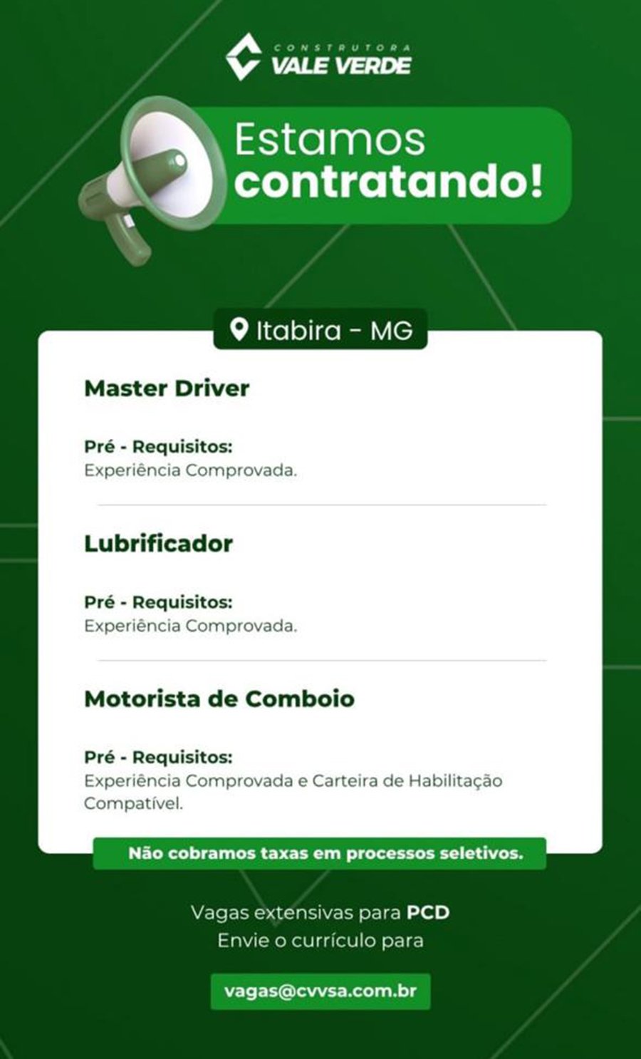 ATENÇÃO: Os interessados pelas vagas devem enviar currículo para o email: vagas@cvvsa.com.br