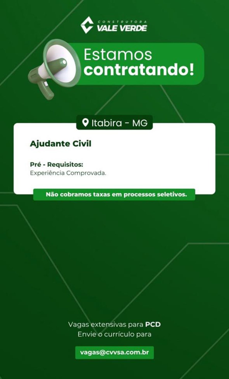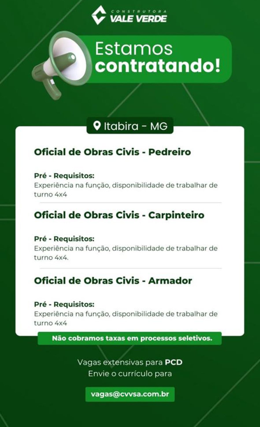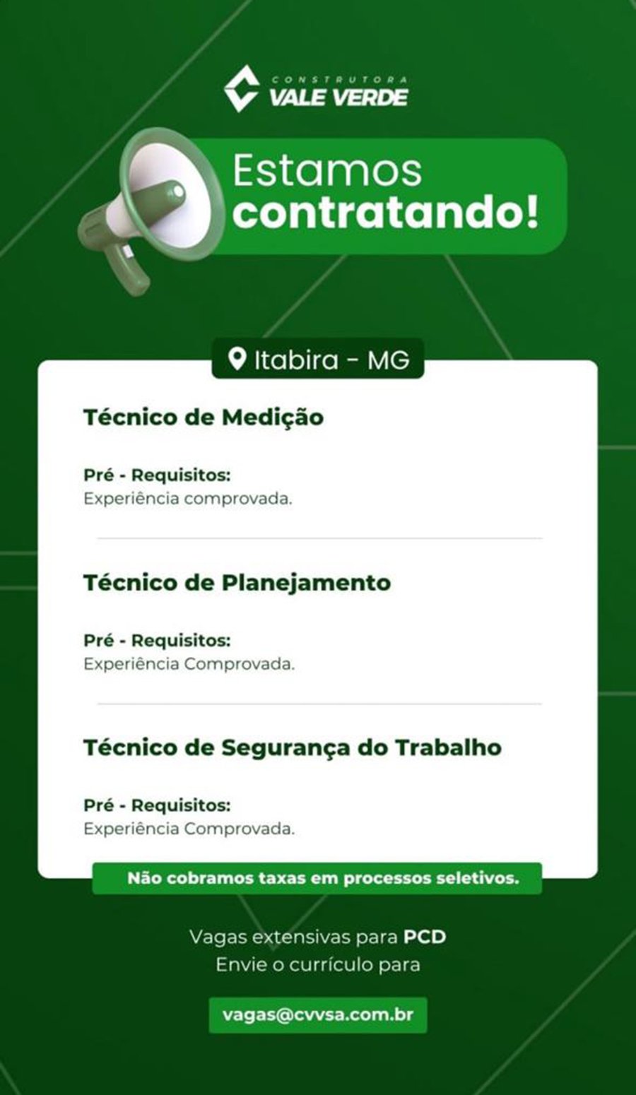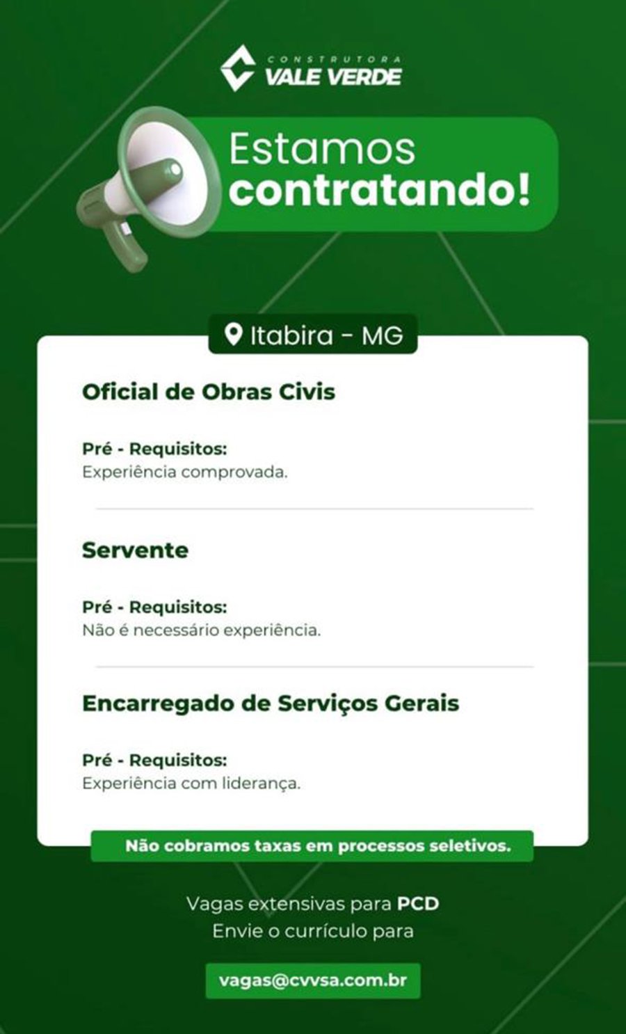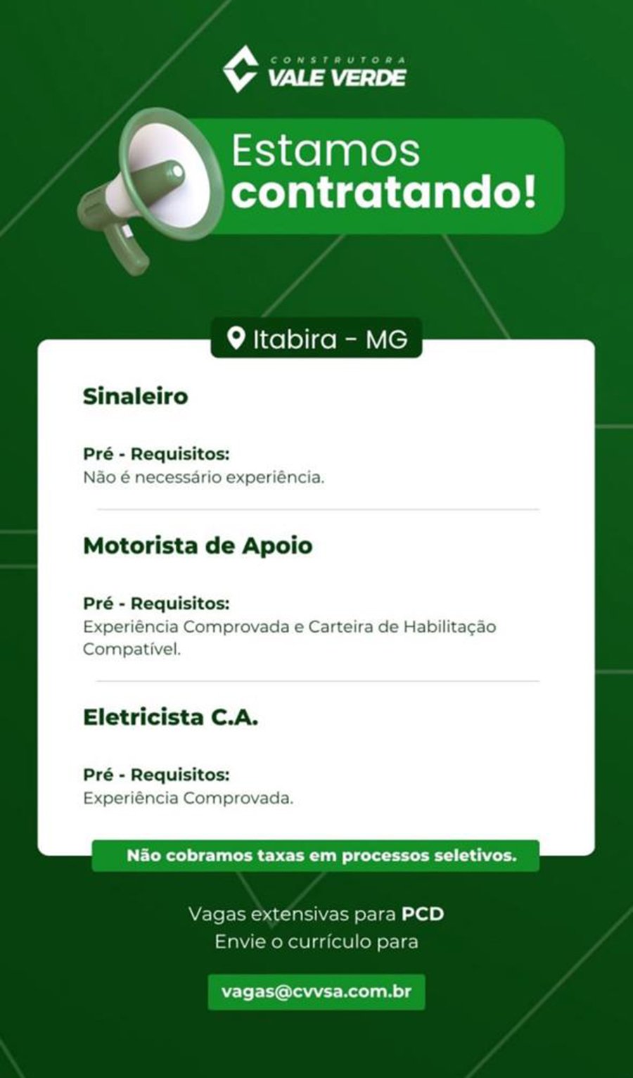 ATENÇÃO: Os interessados pelas vagas devem enviar currículo para o email: vagas@cvvsa.com.br