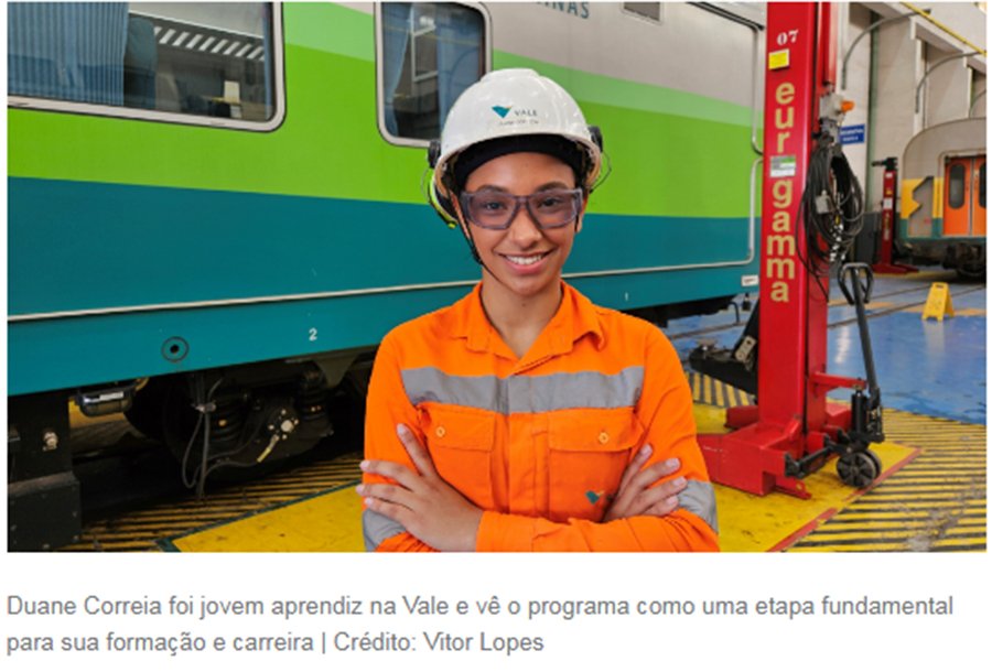 A técnica em mecânica Duane Correia participou do programa e foi contratada para atuar na empresa no Espírito Santo. “Participar do programa Jovem Aprendiz na Vale foi uma experiência enriquecedora e transformadora para mim. Pude aprender na prática como funciona o dia a dia de uma grande empresa, conheci pessoas incríveis que me ensinaram com paciência e me ajudaram a crescer tanto profissionalmente quanto pessoalmente. Esse contato com o ambiente operacional ampliou minha visão de futuro, fortaleceu minha responsabilidade e despertou ainda mais meu interesse pelo crescimento profissional. Sem dúvidas, foi uma etapa fundamental para minha formação e para os próximos passos da minha carreira”, diz.