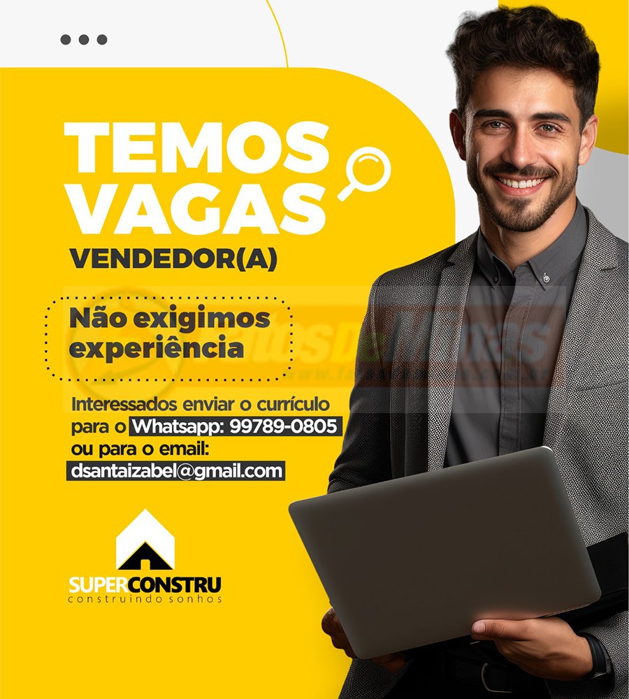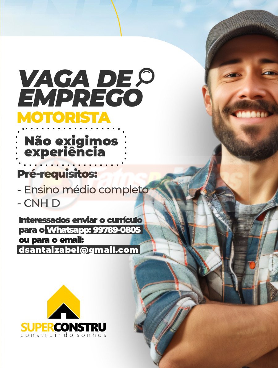 A casa de material de construção Santa Izabel conhecida também por Super Constru, está oferecendo vaga de emprego para vendedor e motorista.