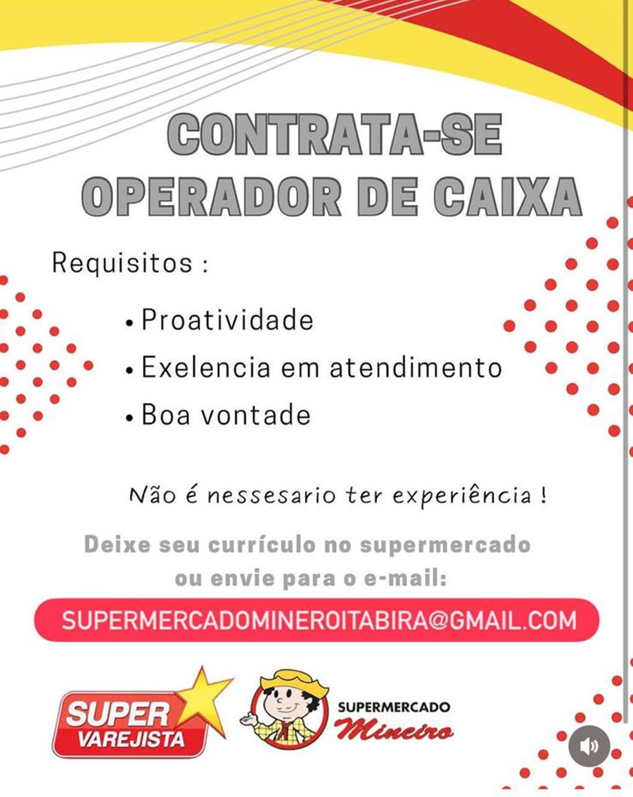 Envie seu currículo para: supermercadomineroitabira@gmail.com