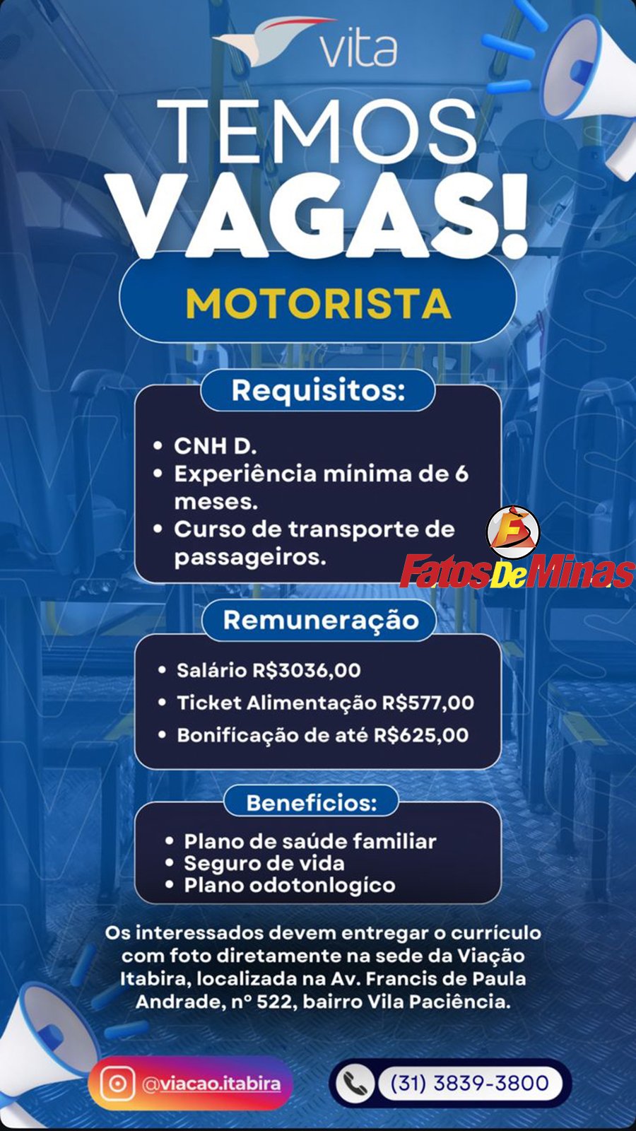 Os interessados às vagas anunciadas, devem entregar o currículo com foto, diretamente na sede da Viação Itabira, localizada na avenida Francis de Paula Andrade, 522, Vila Paciência, em Itabira