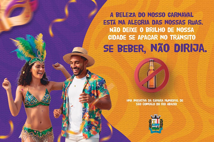 A Câmara Municipal de São Gonçalo do Rio Abaixo acredita que a conscientização é a melhor forma de prevenir ocorrências e garantir que o carnaval seja marcado apenas por boas lembranças. Com respeito, responsabilidade e empatia, é possível celebrar com alegria e segurança. NÃO É NÃO. SE BEBER, NÃO DIRIJA.