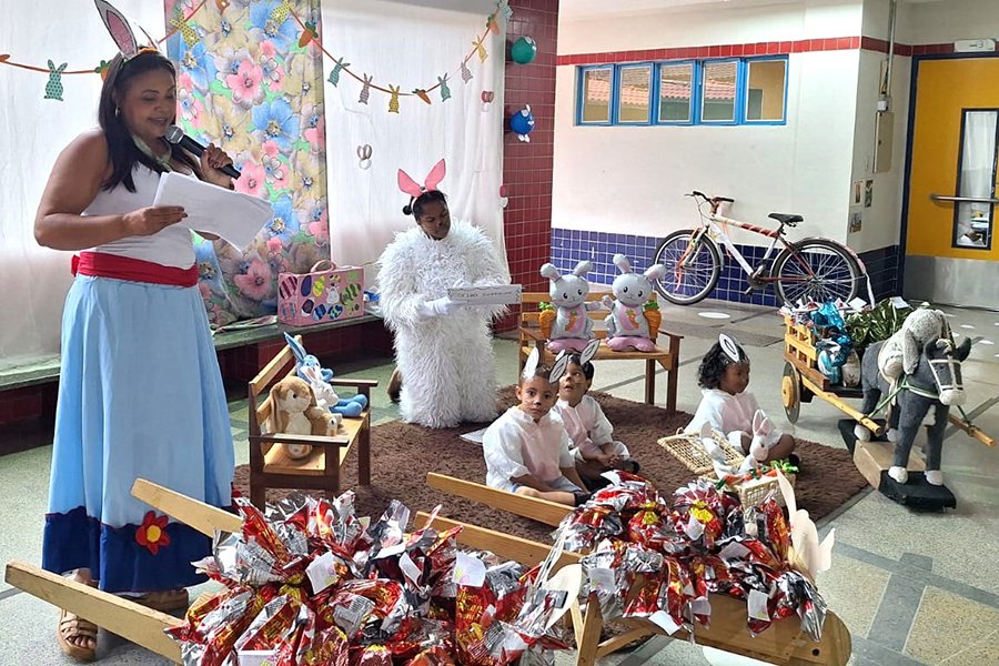 Em algumas unidades, como o Centro de Educação Infantil José de Alencar (CEI), a distribuição foi acompanhada por uma peça teatral com temática pascal.