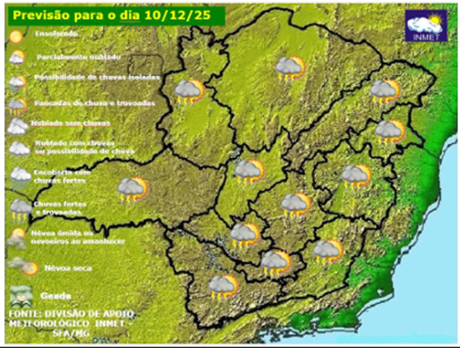 MINAS GERAIS – Quarta-feira, dia 10 de dezembro de 2025, de tempo instável em Minas Gerais, devido a permanência do canal de umidade, entre a Amazônia e o Brasil Central e Sudeste, direcionado para o estado. Situação que favorece a ocorrência das típicas pancadas de primavera em todas as regiões mineiras. Vale ressaltar que a configuração da atmosfera visa alimentar o ciclone extratropical em formação no sul do país. No decorrer da quarta-feira, o ciclone se posiciona sobre o oceano, favorecendo ventos intensos no litoral das regiões sul e sudeste. Em Minas Gerais, o efeito do ciclone será indireto e percebido principalmente por ventos mais fortes no Sul de Minas e Zona da Mata, mas não tão intensos quanto os que devem atingir o litoral das regiões sul e sudeste.