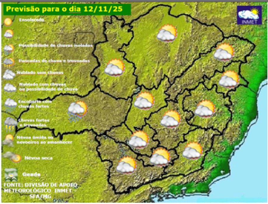 MINAS GERAIS – Quarta-feira, dia 12 de novembro de 2025, de tempo estável em Minas Gerais. Com o afastamento do centro de alta pressão pós-frontal para o alto mar, o transporte de umidade do oceano para o interior do continente enfraquece. Essa condição reduz a nebulosidade e favorece a elevação das temperaturas em praticamente todo o estado. Há pequena possibilidade de chuva isolada no Triângulo Mineiro, em razão da influência de áreas de instabilidade que atuarão sobre o Mato Grosso do Sul e o oeste de São Paulo.