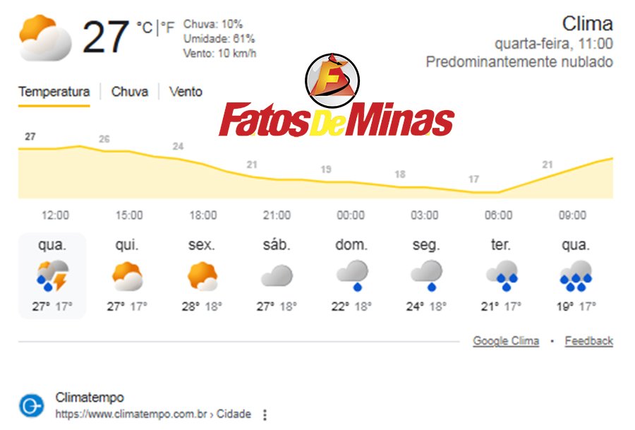 Céu parcialmente nublado com pancadas de chuva e trovoadas isoladas no Triângulo Mineiro/Alto Paranaíba, Oeste, Sul/Sudoeste, Campo das Vertentes e Zona da Mata. Céu claro a parcialmente nublado no Norte. Demais regiões, céu claro a parcialmente nublado com possibilidade de chuva isolada.