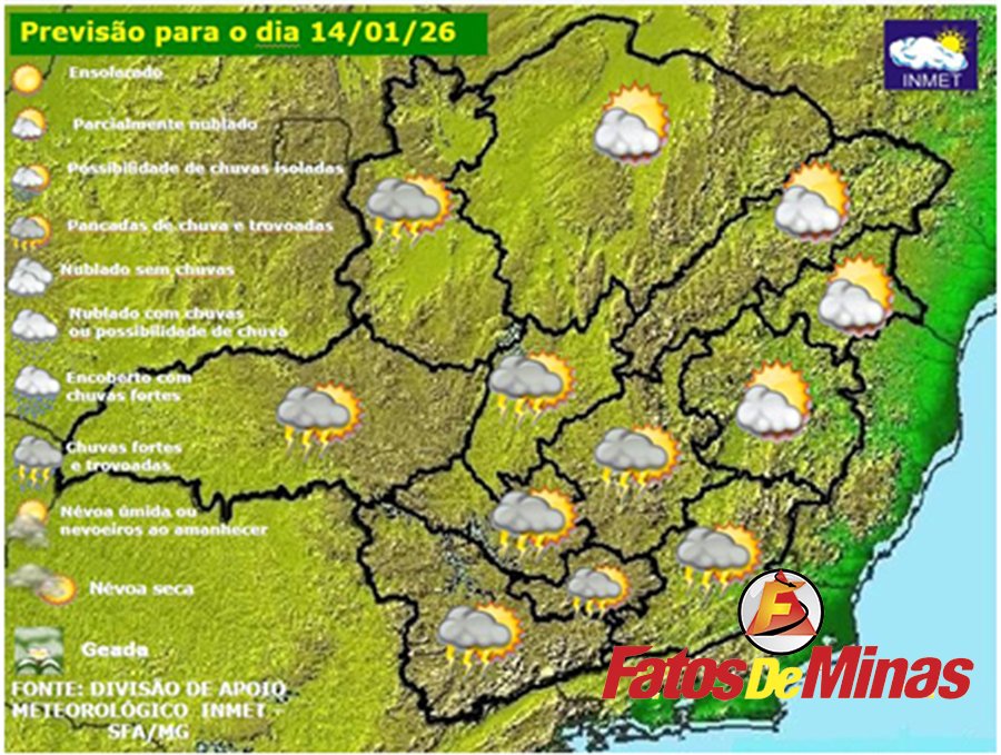MINAS GERAIS – Quarta-feira, dia 14 de janeiro de 2026, instabilidades provocam as típicas pancadas de verão no oeste e sul de Minas Gerais. A circulação dos ventos (cavado) e disponibilidade de umidade em médios níveis da atmosfera favorecem a ocorrência de temporais em parte do estado. A tendência é de amenizar o calor nas áreas com previsão de chuva.