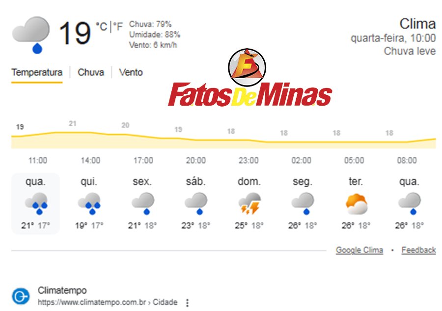 Céu encoberto com pancadas de chuva no Noroeste, Norte, Jequitinhonha, Rio Doce, Mucuri, Zona da Mata, Metropolitana e Central Mineira. Céu nublado a parcialmente nublado com pancadas de chuva e trovoadas isoladas no Triângulo Mineiro/Alto Paranaíba. Demais regiões, céu nublado com chuva.