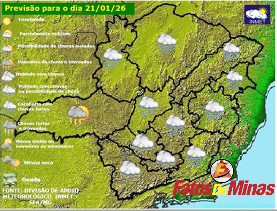 MINAS GERAIS – Nesta quarta-feira, dia 21 de janeiro de 2026, a ZCAS (Zona de Convergência do Atlântico Sul) mantém praticamente todo o estado com muita nebulosidade e chuvas praticamente contínuas. Entretanto, espera-se redução das chuvas no Sul e Campo das Vertentes. Já no Triângulo Mineiro, momentos de mormaço ou abertura de sol favorecem a ocorrência das típicas pancadas de verão. O sistema tende a atuar sobre o estado até o fim de semana, contudo, deve provocar chuvas em praticamente todas as regiões mineiras até a quinta-feira. A partir de sexta-feira, a área de atuação da ZCAS deve compreender uma faixa central do estado, do Noroeste em direção à Zona da Mata.