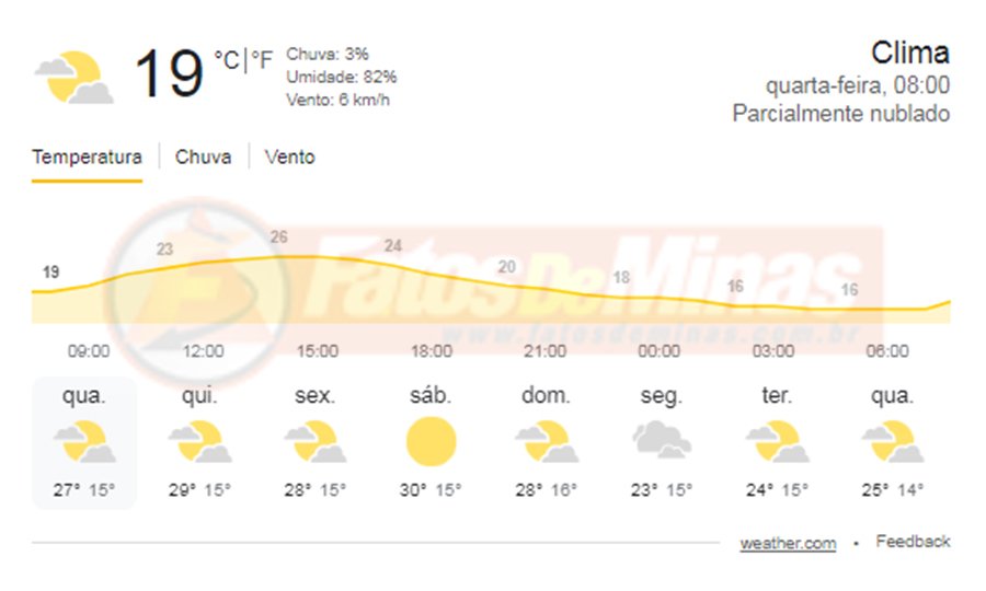 Céu claro a parcialmente nublado no Jequitinhonha, Mucuri e Rio Doce. Céu claro a parcialmente nublado na Zona da Mata, Campo das Vertentes, Sul/Sudoeste e Metropolitana. Demais regiões, céu claro a parcialmente nublado com névoa seca.