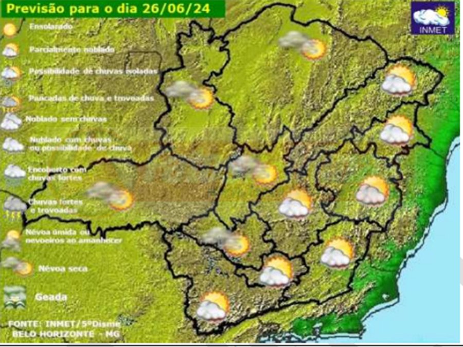 MINAS GERAIS – Nesta quarta-feira, dia 26 de junho de 2024, o transporte de umidade de origem oceânica mantém maior concentração de nuvens no centro leste de Minas Gerais. No restante do estado, predomínio de sol e baixos índices de umidade (inferior a 30%) no período da tarde. As temperaturas permanecem estáveis, com a máxima no estado em torno de 32ºC, prevista para o Triângulo Mineiro, Noroeste Norte mineiro.