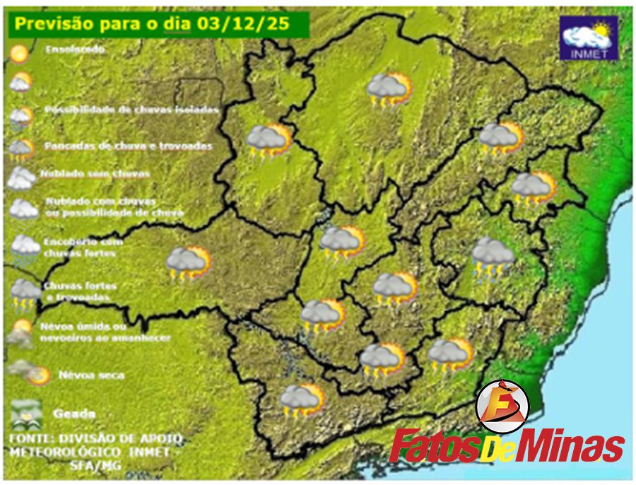 MINAS GERAIS – Quarta-feira, dia 3 de dezembro de 2025, típica de estação chuvosa em Minas Gerais. A formação e atuação de uma área de baixa pressão nas imediações do litoral paulista tende a estabelecer o canal de umidade entre a Amazônia e as regiões Centro–Oeste e Sudeste, resultando em tempo instável com chuva em todo o estado. Inicialmente, as chuvas devem ocorrer em forma de pancadas isoladas, porém de forma generalizada no estado. A partir de quinta-feira, o direcionamento do canal de umidade para o centro-norte mineiro, pode dar origem ao primeiro episódio da Zona de Convergência do Atlântico Sul a atuar sobre Minas neste período chuvoso.