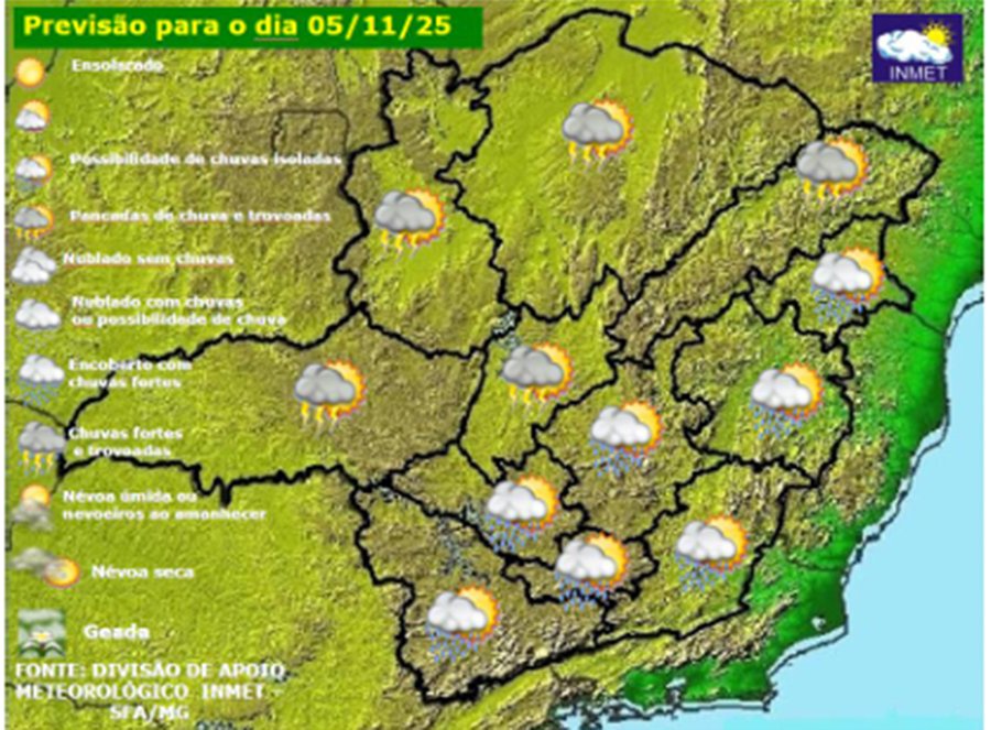 MINAS GERAIS – Nesta quarta-feira, dia 5 de novembro de 2025, as típicas pancadas de fim de tarde são esperadas para o centro-norte e oeste de Minas Gerais. A combinação entre disponibilidade de umidade e aquecimento diurno favorece a ocorrência das típicas pancadas de primavera nas regiões citadas. No restante do estado, variação de nebulosidade e apenas possibilidade de chuva isolada. Em todas as regiões mineiras prevalece o tempo abafado.