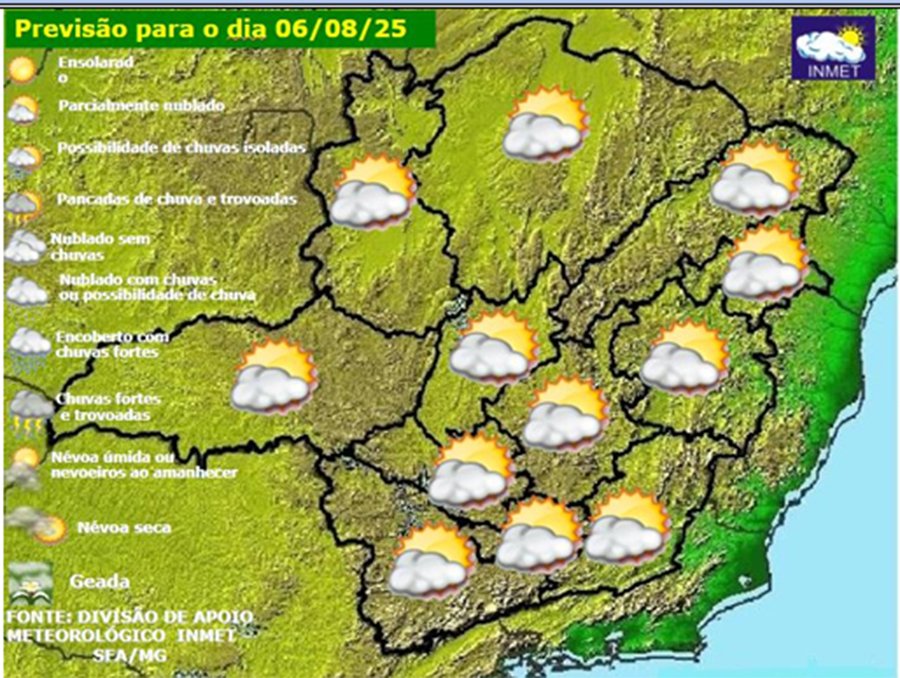 MINAS GERAIS – Quarta-feira, dia 6 de agosto de 2025, de tempo estável em Minas Gerais. O dia amanhece com muitas nuvens no centro-leste mineiro, mas a nebulosidade reduz no decorrer do dia. No restante do estado, sol entre poucas nuvens, porém com umidade acima de níveis críticos. Uma melhora momentânea no tempo seco.