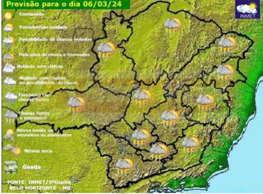 MINAS GERAIS – Nesta quarta-feira, 6 de março de 2024, o avanço de uma frente fria pelo litoral da Região Sudeste intensificará as instabilidades no centro sul e oeste de Minas Gerais. A tendência é de alteração nas condições do tempo no decorrer do dia e permanência das instabilidades até pelo menos a próxima sexta-feira. Por outro lado, no Norte e Leste do estado, as chuvas tendem a reduzir gradativamente nos próximos dias.