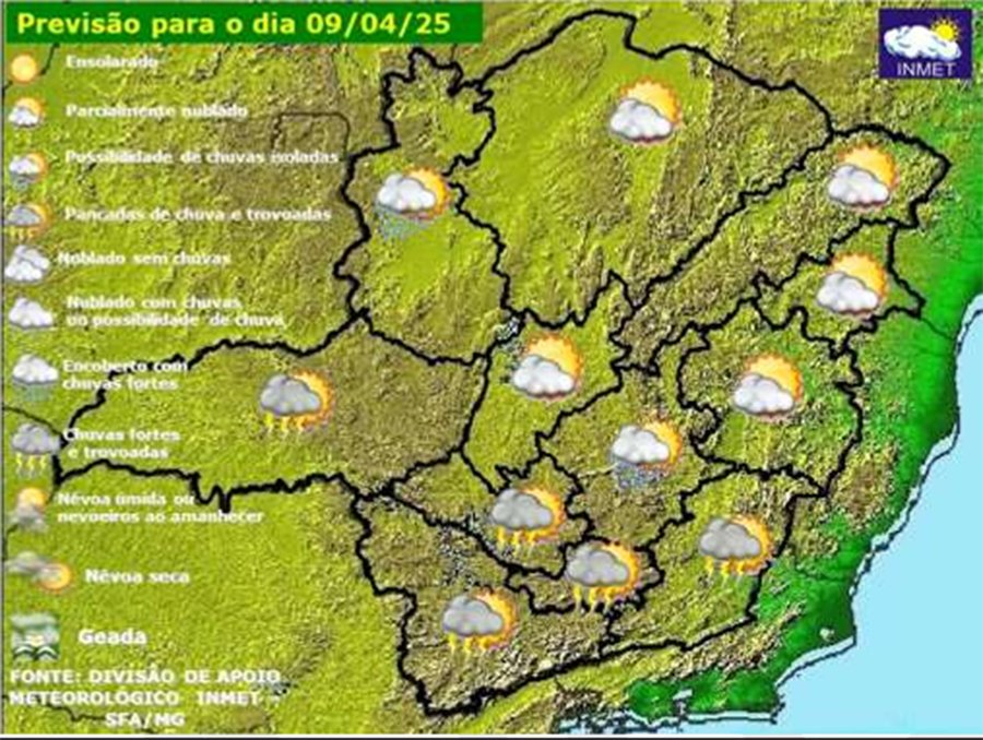 Céu claro a parcialmente nublado com pancadas de chuva e trovoadas isoladas no Triângulo Mineiro/Alto Paranaíba, Oeste, Sul/Sudoeste, Campo das Vertentes e Zona da Mata. Céu parcialmente nublado no Jequitinhonha, Mucuri e Rio Doce. Demais regiões, céu claro a parcialmente nublado. Possibilidade de chuva isolada na Metropolitana e Noroeste.