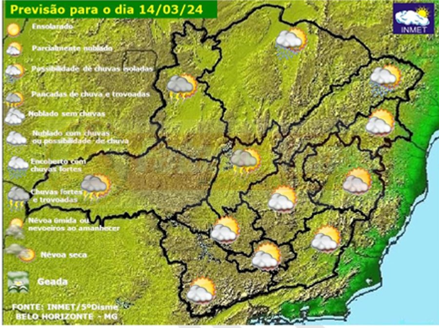 Céu parcialmente nublado com pancadas de chuva e trovoadas isoladas no Noroeste, Central Mineira e Triângulo Mineiro/Alto Paranaíba. Céu parcialmente nublado com possibilidade de chuva isolada no Norte e Jequitinhonha. Demais regiões, céu claro a parcialmente nublado.