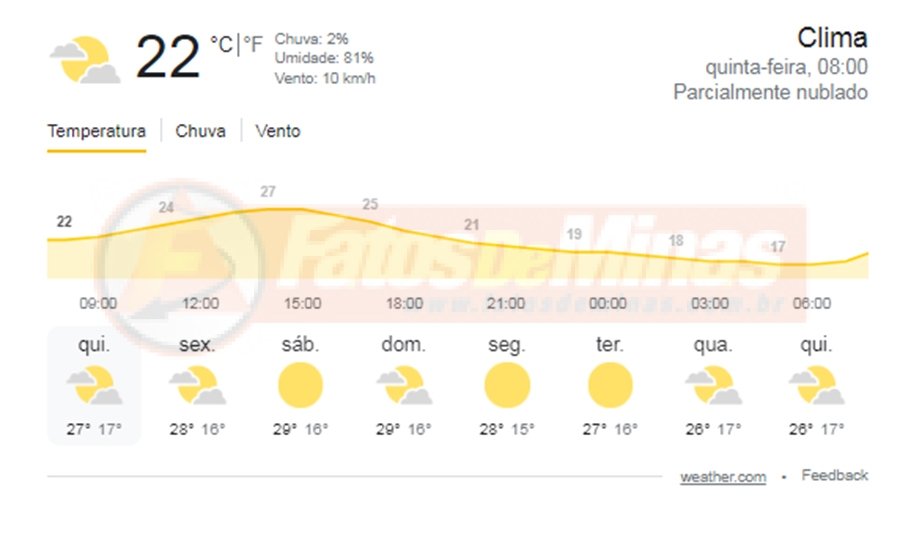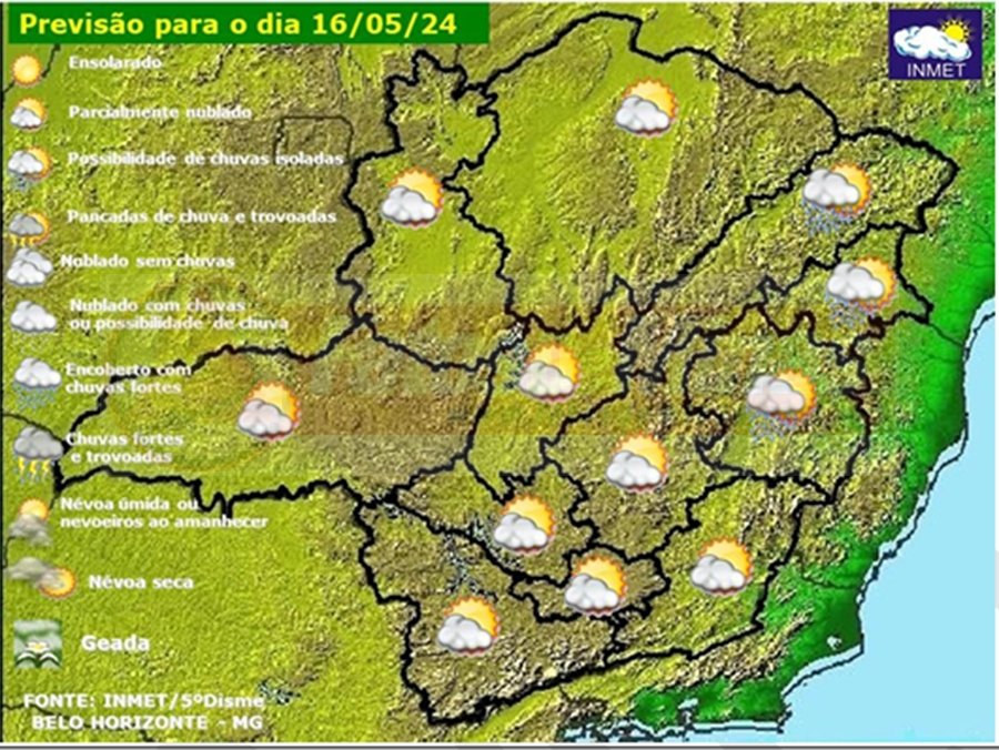 Céu parcialmente nublado com possibilidade de chuvisco ou chuva fraca no Jequitinhonha, Mucuri e Rio Doce. Céu parcialmente nublado na Zona da Mata. Demais regiões, claro a parcialmente nublado. Névoa seca no Triângulo Mineiro/Alto Paranaíba.